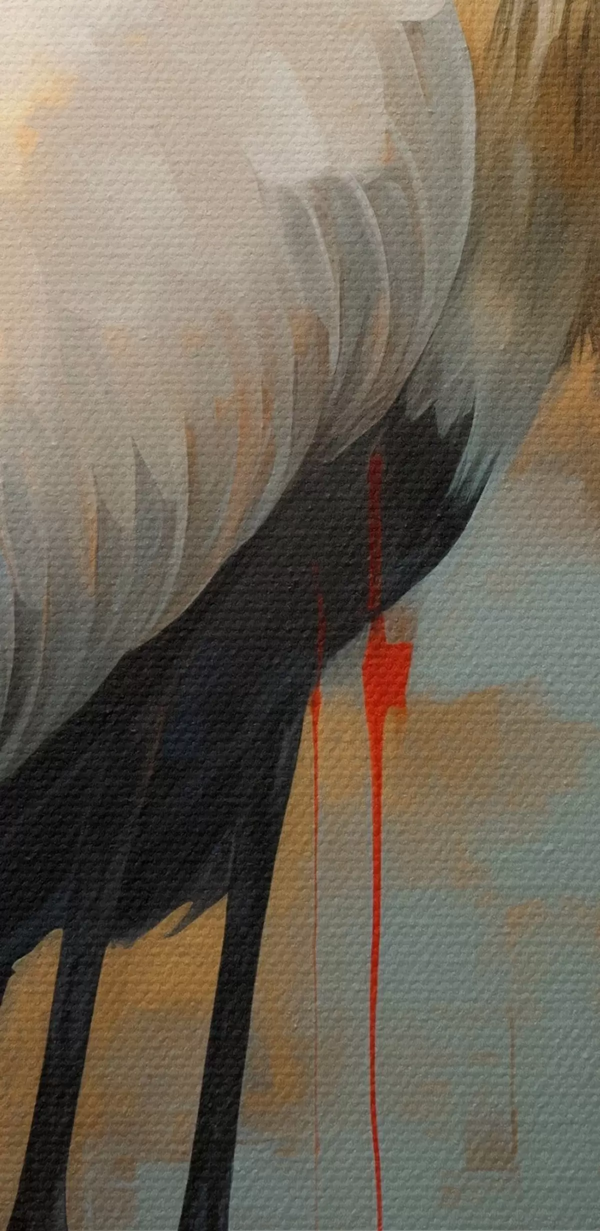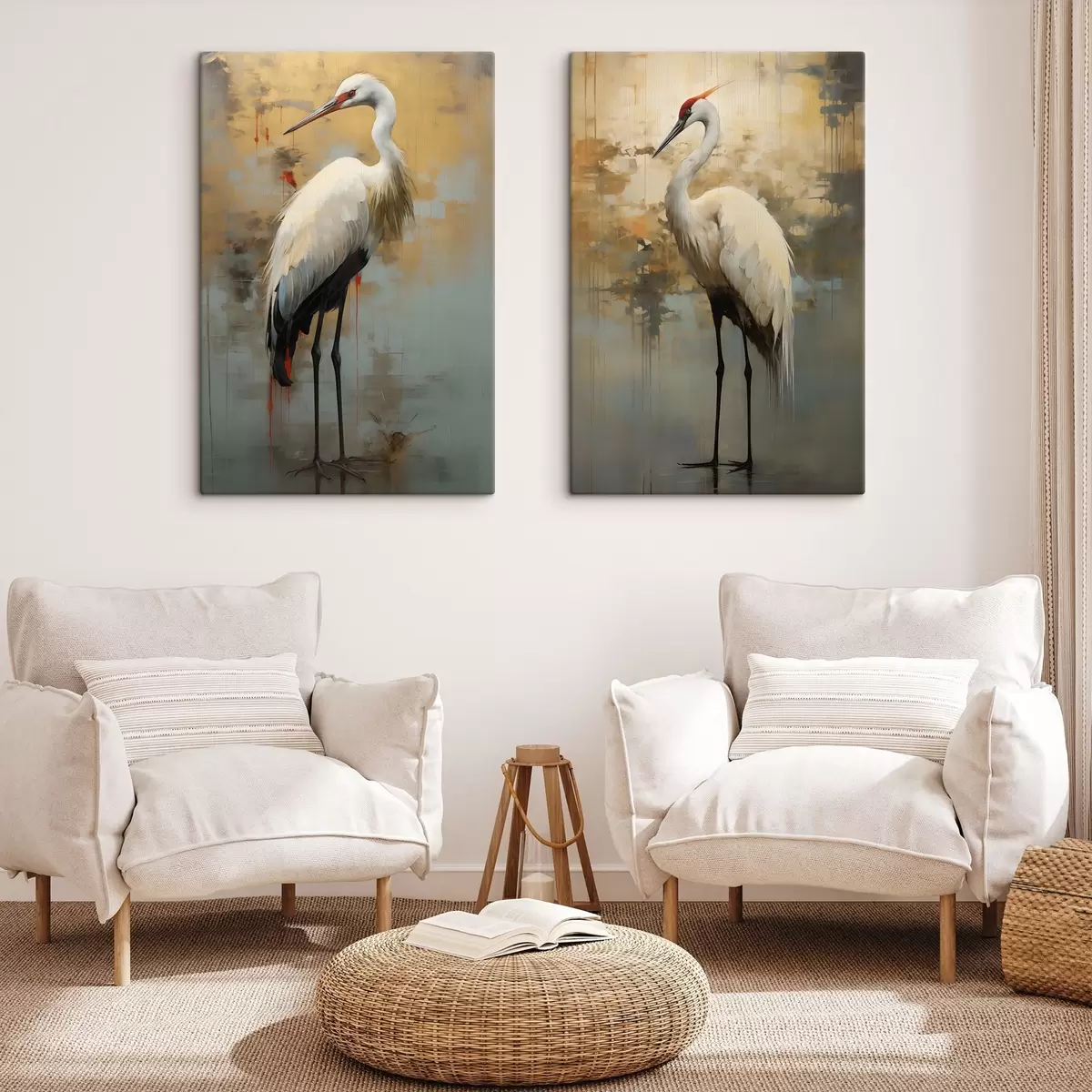 Cuadros Garza blanca sobre un fondo de tonos amarillos, marrones y azules apagados que sugieren un paisaje brumoso y abstracto Nr m00530