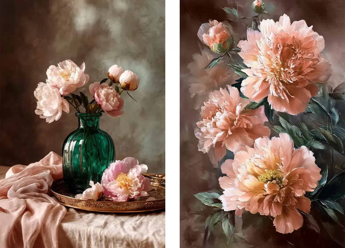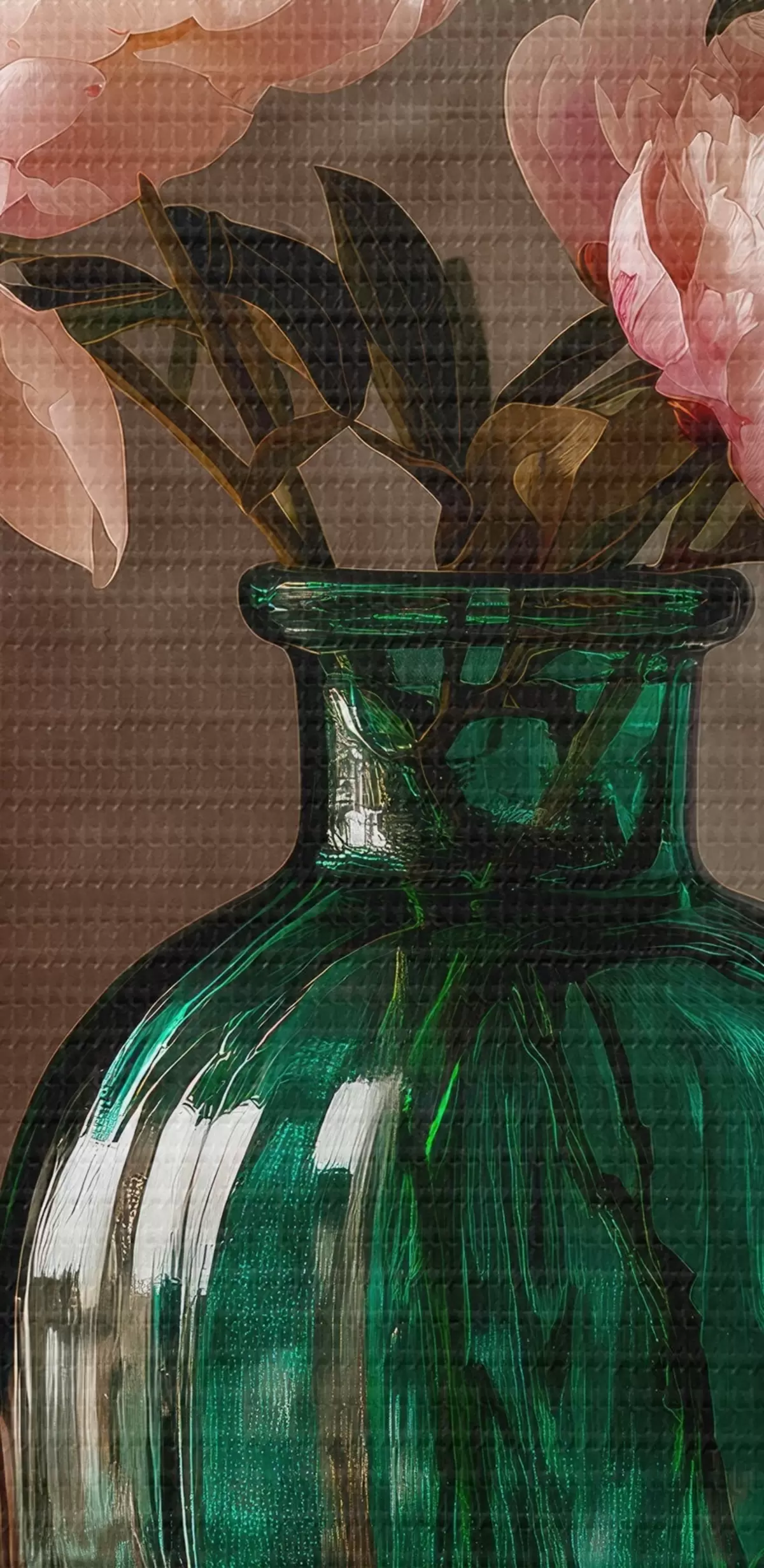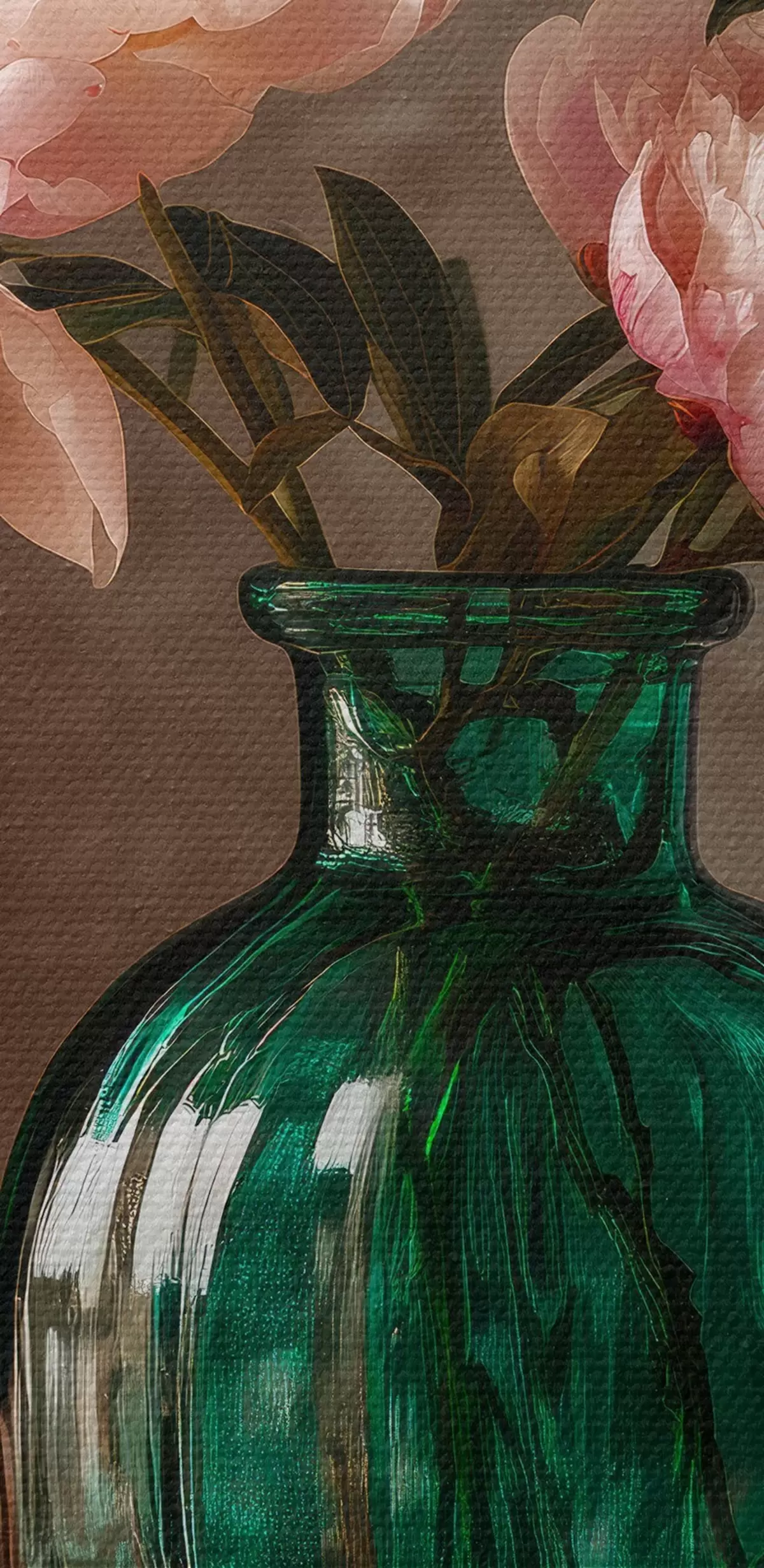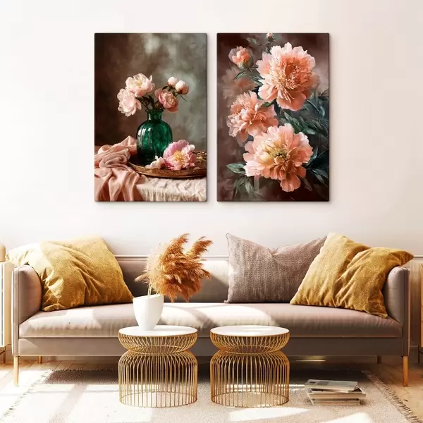 Cuadros Composición pareada con peonías rosas en jarrón y sobre lienzo Nr m00578