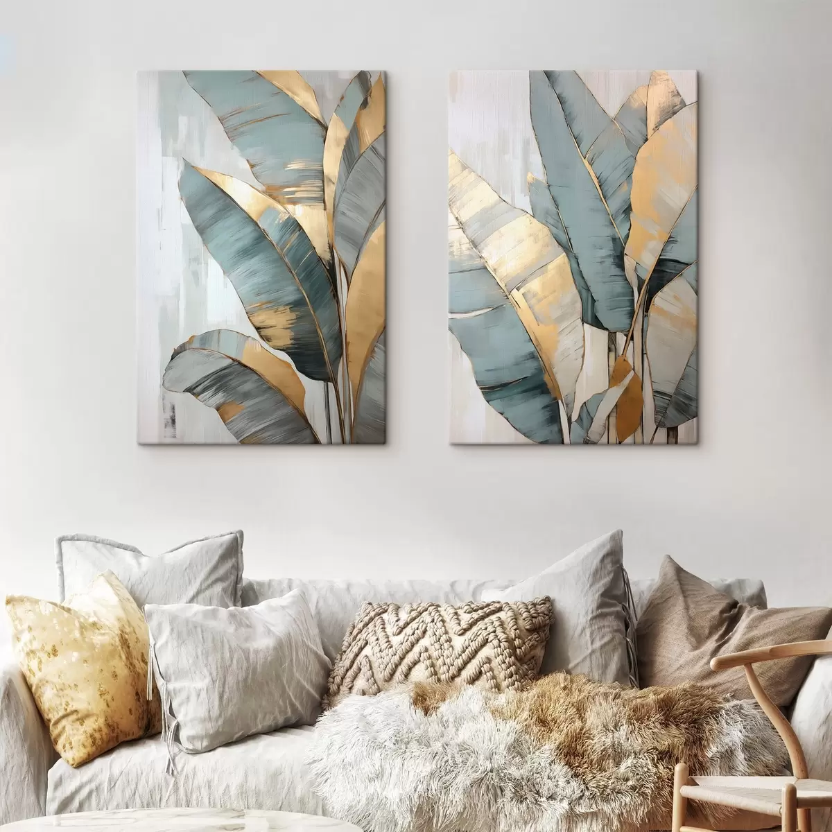 Cuadros Conjunto de hojas de plátano azules, grises y amarillas con pinceladas visibles, sobre un fondo blanco abstracto Nr m00645