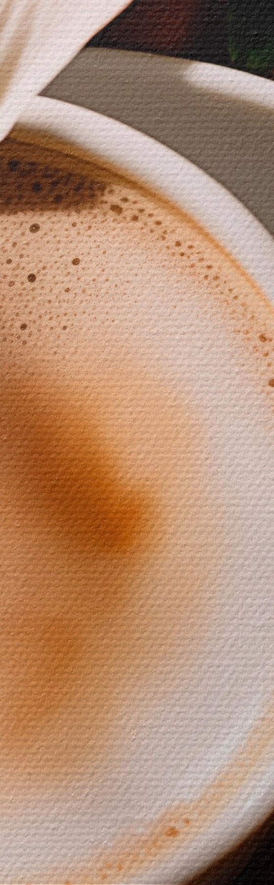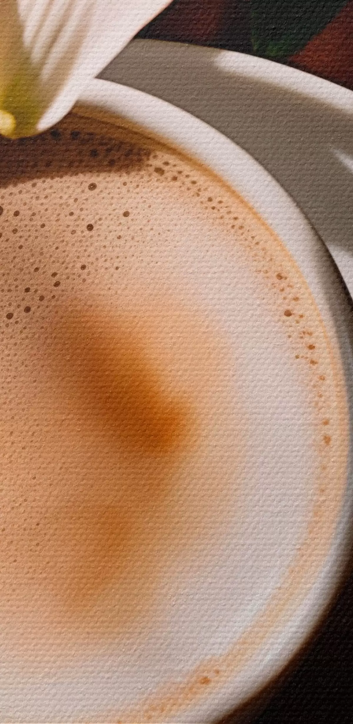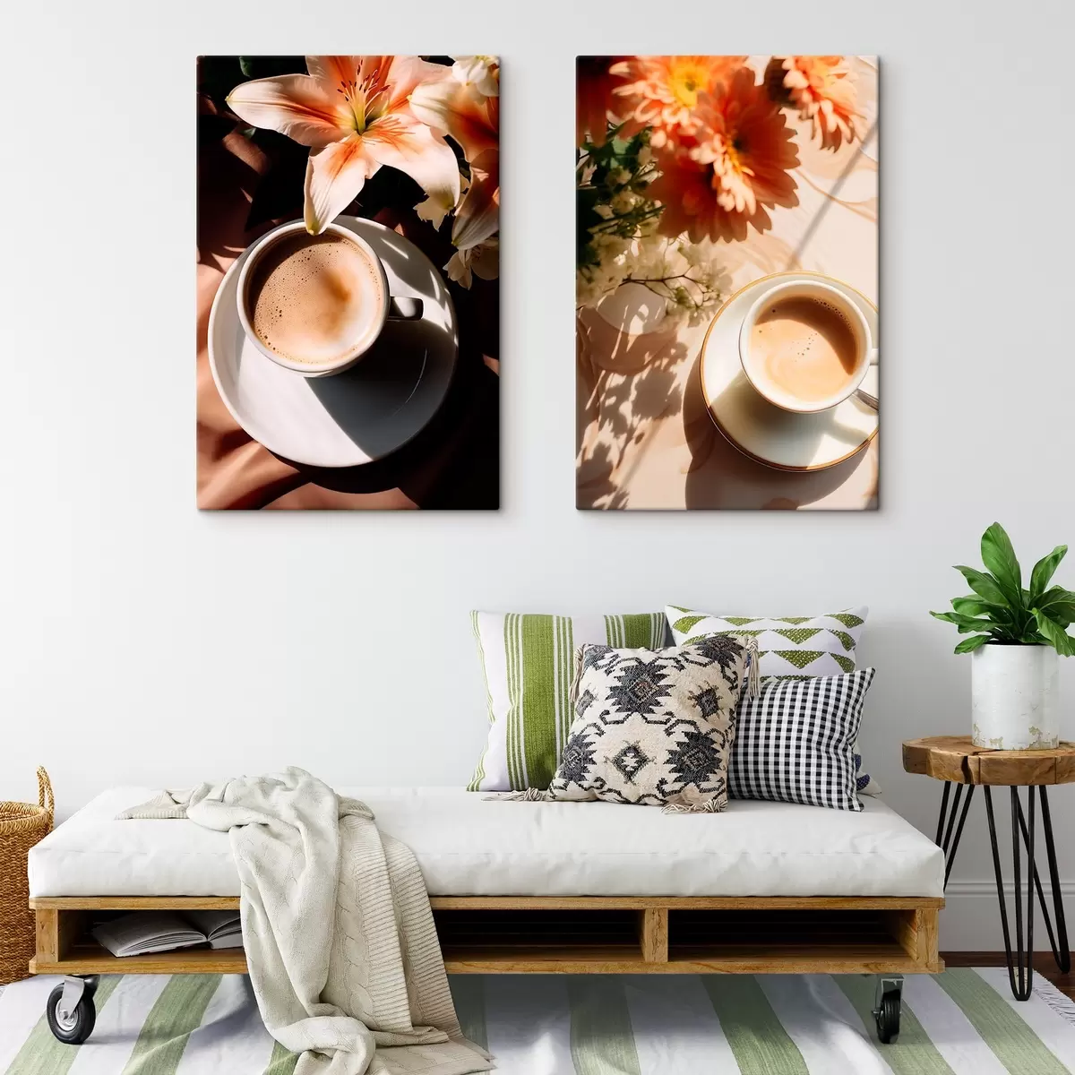 Cuadros Una taza de café con espuma en un plato blanco, unas flores al fondo, con luz solar Nr m00654