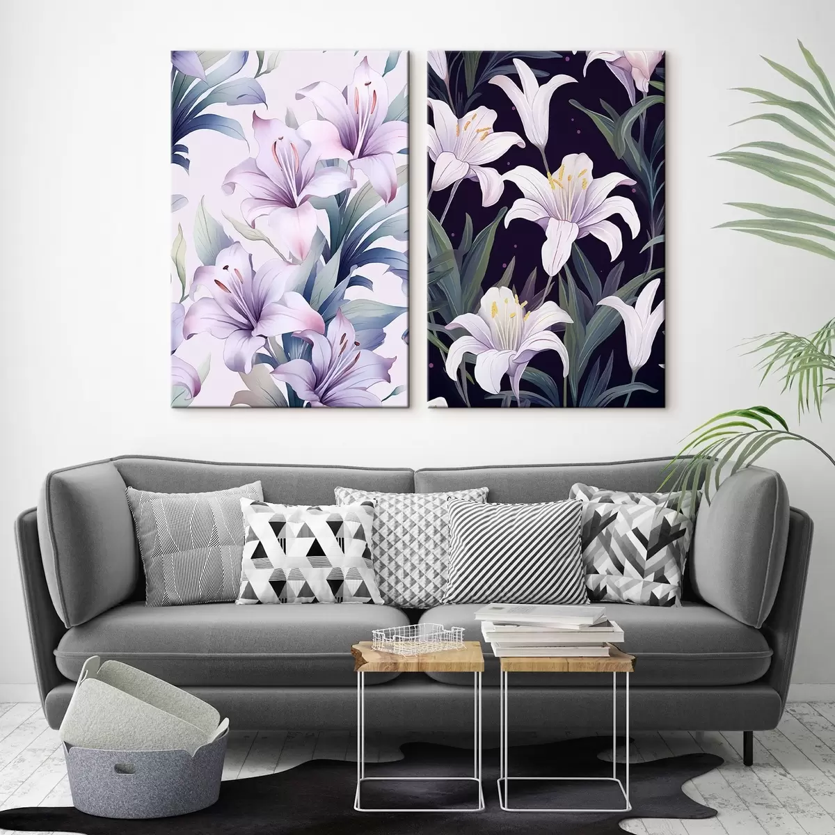 Cuadros Delicados lirios rosas con hojas verdes sobre fondo claro y oscuro Nr m00689