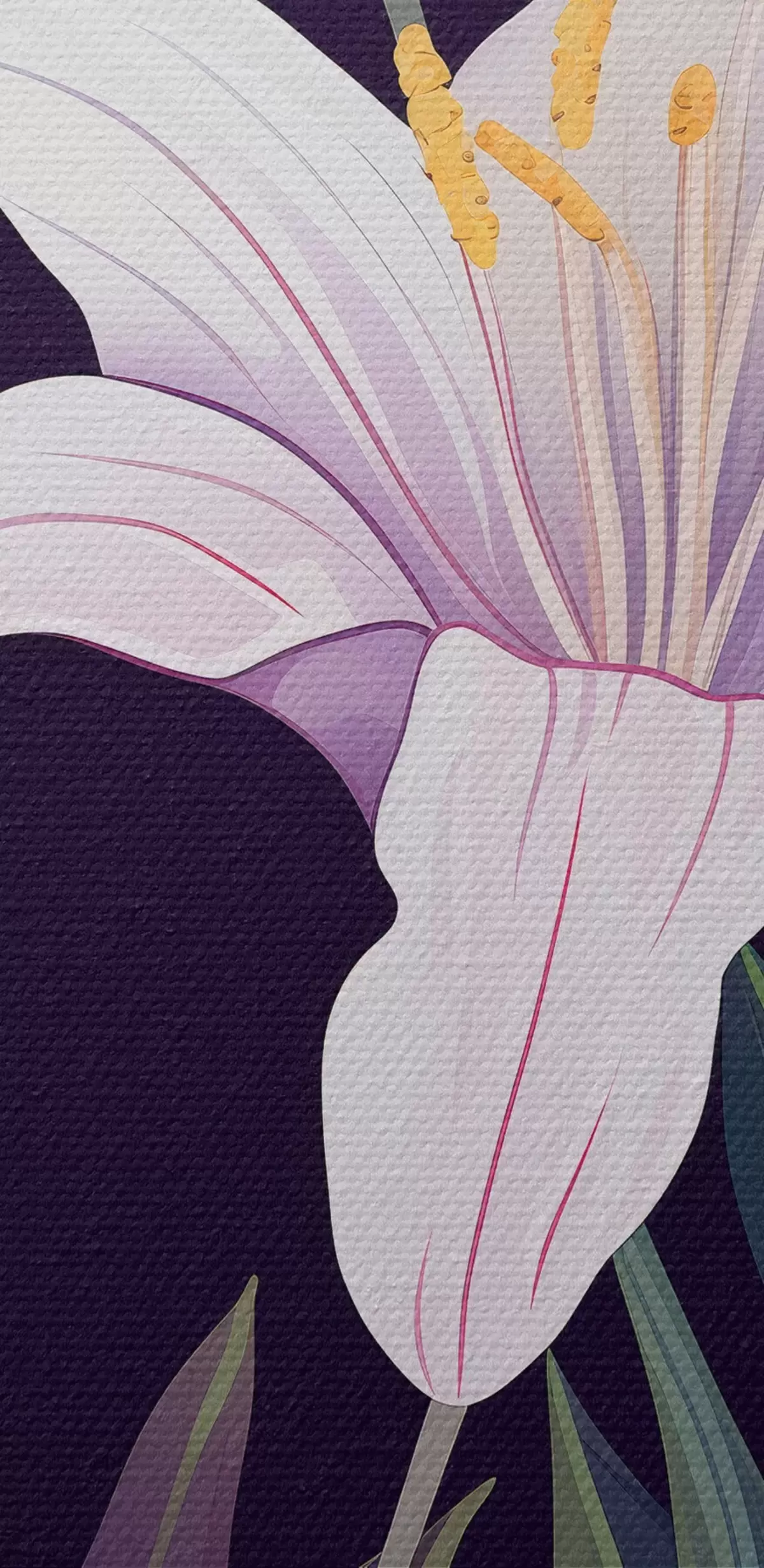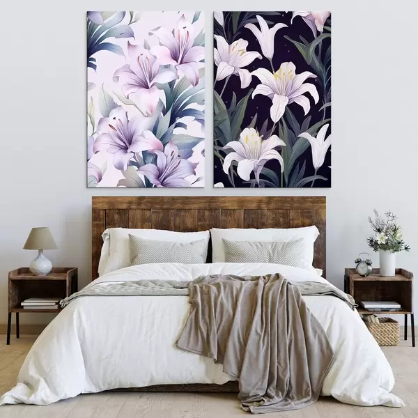 Cuadros Delicados lirios rosas con hojas verdes sobre fondo claro y oscuro Nr m00689