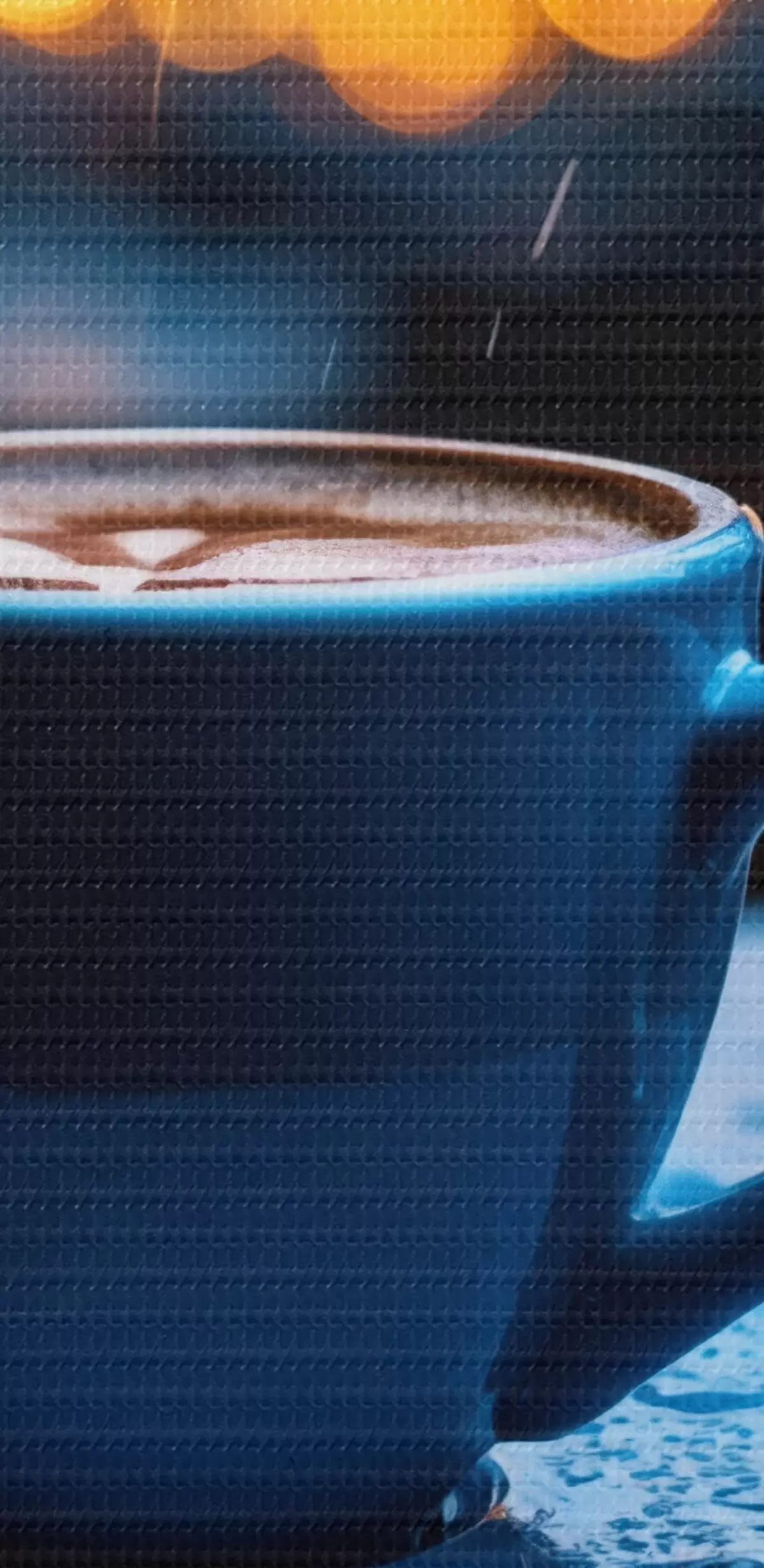 Cuadros Flores azules con gotas de agua y una taza de café bajo la lluvia Nr m00694