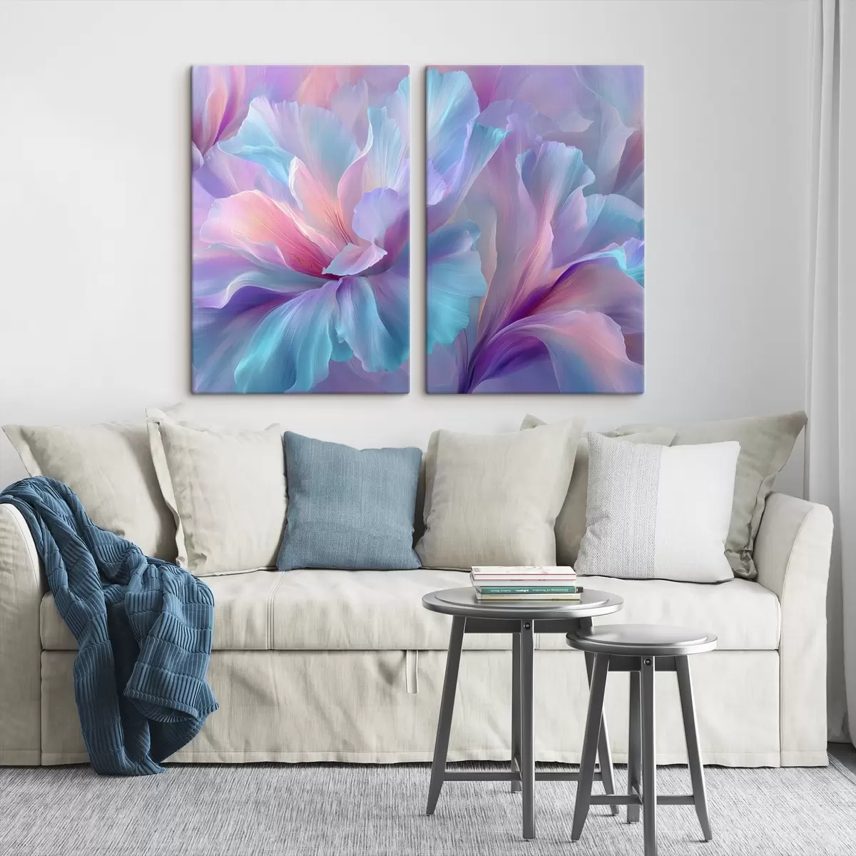 Cuadros una delicada fantasía floral con pétalos en tonos morados, azules y rosados. Nr m00700