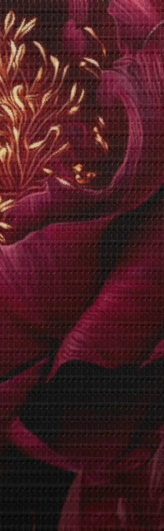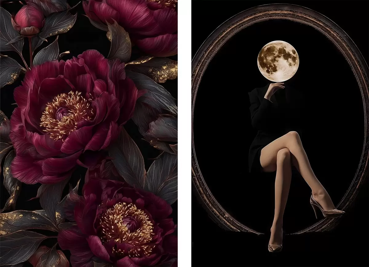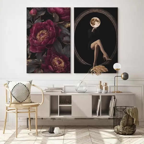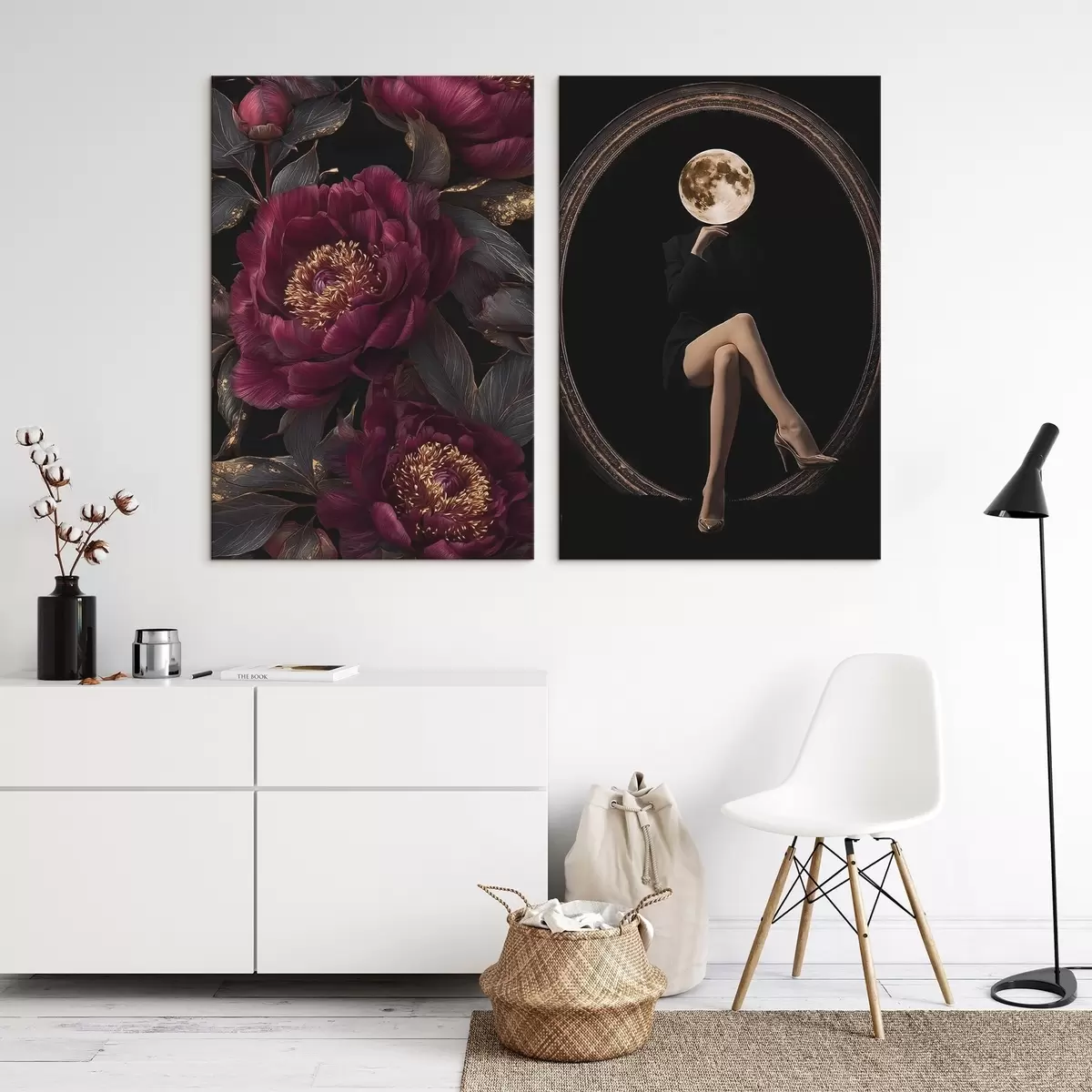 Cuadros Peonías de color burdeos y una silueta con cabeza de luna sobre fondo negro Nr m00765