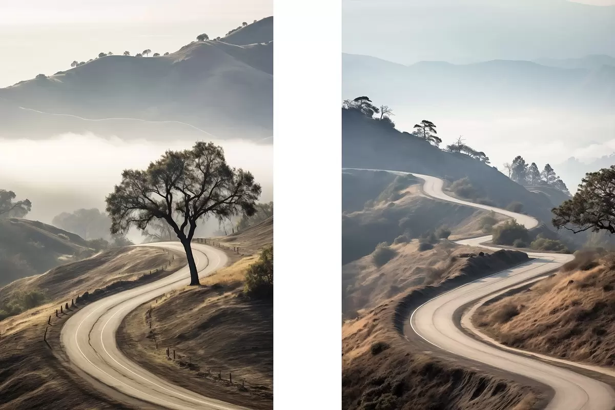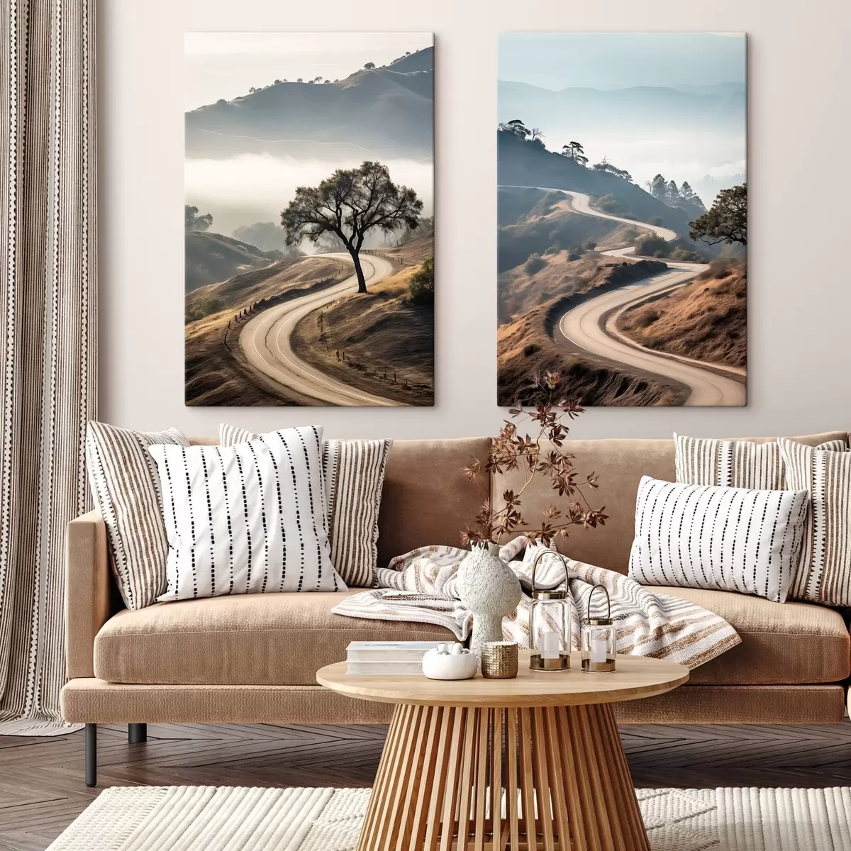 Cuadros Una sinuosa carretera que atraviesa un paisaje montañoso con hierba seca bajo un cielo despejado y montañas en la distancia. Nr m00887