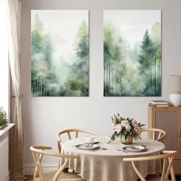 Cuadros Imitación de pintura en acuarela de un bosque abstracto con árboles altos y follaje verde, colores suaves y apagados Nr m01005
