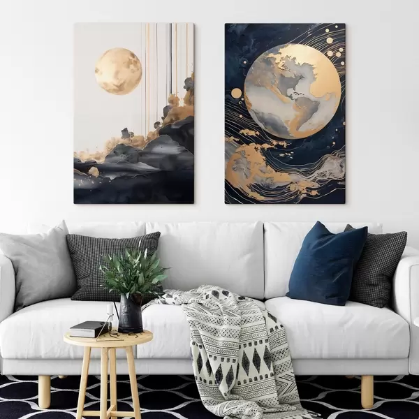Cuadros Planeta decorativo texturizado en el espacio con líneas y puntos amarillos, estilo abstracto, minimalista y moderno. Nr m01014