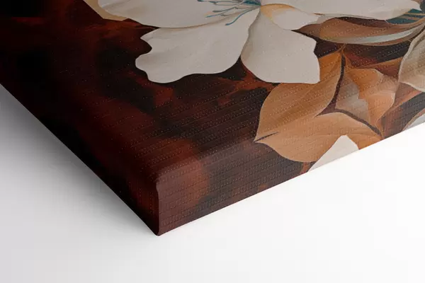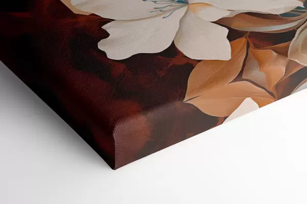 Cuadros Flores y hojas blancas abstractas con un fondo marrón y azul con formas abstractas, en un estilo minimalista. Nr m01015