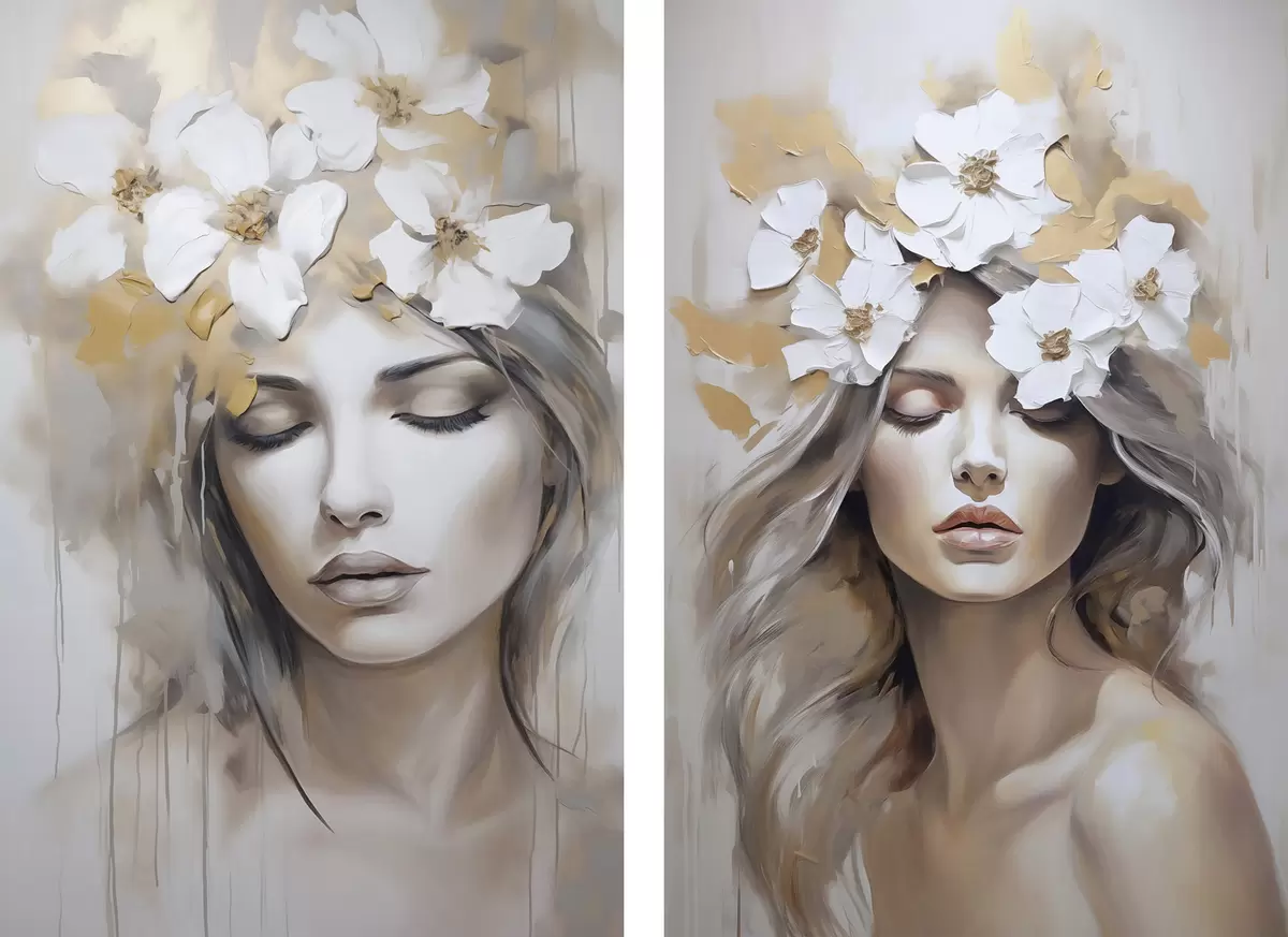 Cuadros Retrato abstracto de una niña con flores, imitación de pintura. Nr m01034