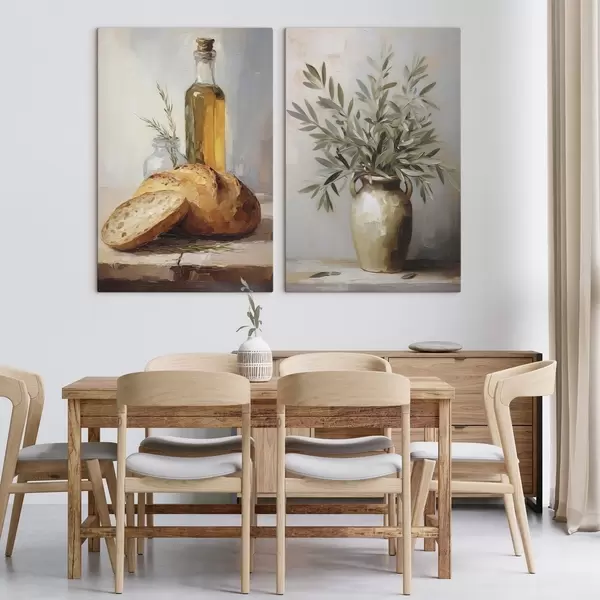 Cuadros Ramas de olivo en un jarrón, pan y una botella de aceite, pintura de imitación. Nr m01035