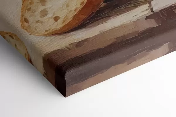 Cuadros Ramas de olivo en un jarrón, pan y una botella de aceite, pintura de imitación. Nr m01035