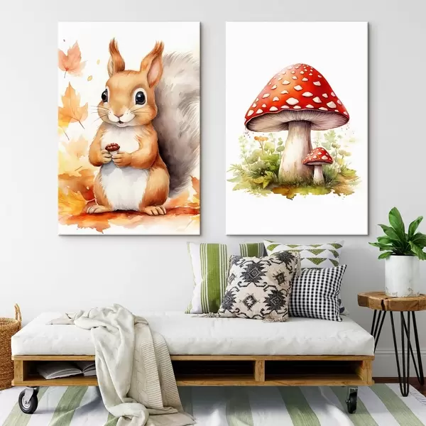 Cuadros Ardilla y seta del bosque, amanita muscaria, imitación de acuarela. Nr m01049