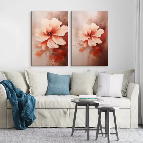 Cuadros Composición floral: pétalos blancos y crema, detalles en coral y un suave fondo brumoso. Nr m01088