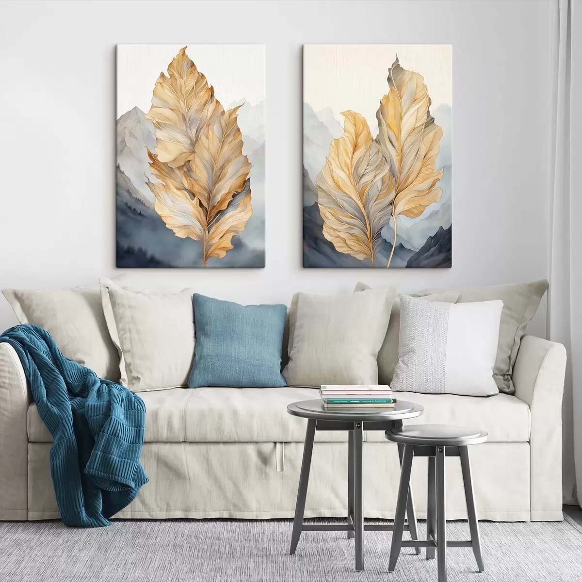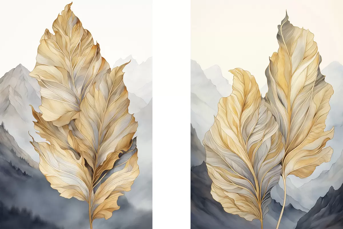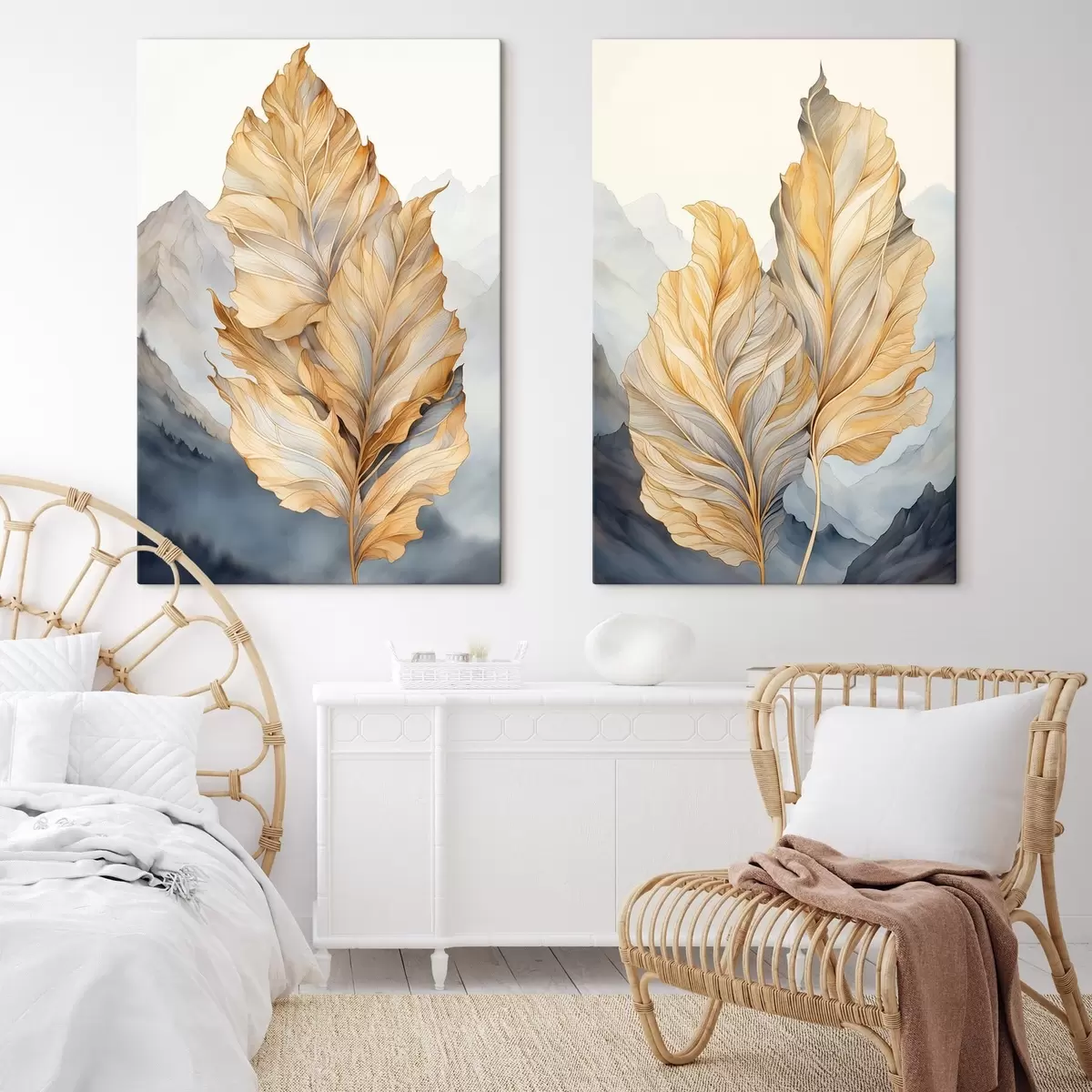 Cuadros Hojas abstractas grandes, amarillas y marrones con detalles intrincados, sobre un paisaje montañoso. Nr m01119