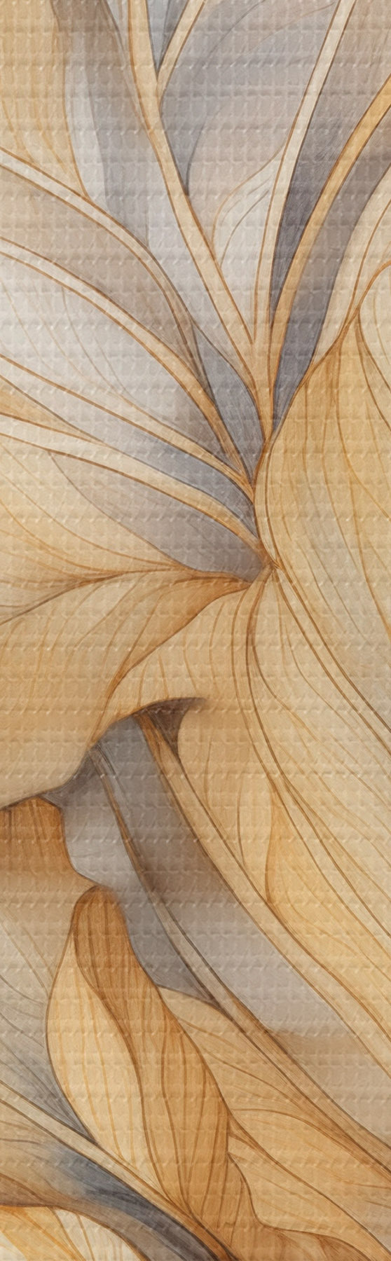murales de pared Hojas abstractas grandes, amarillas y marrones con detalles intrincados, sobre un paisaje montañoso. m01119