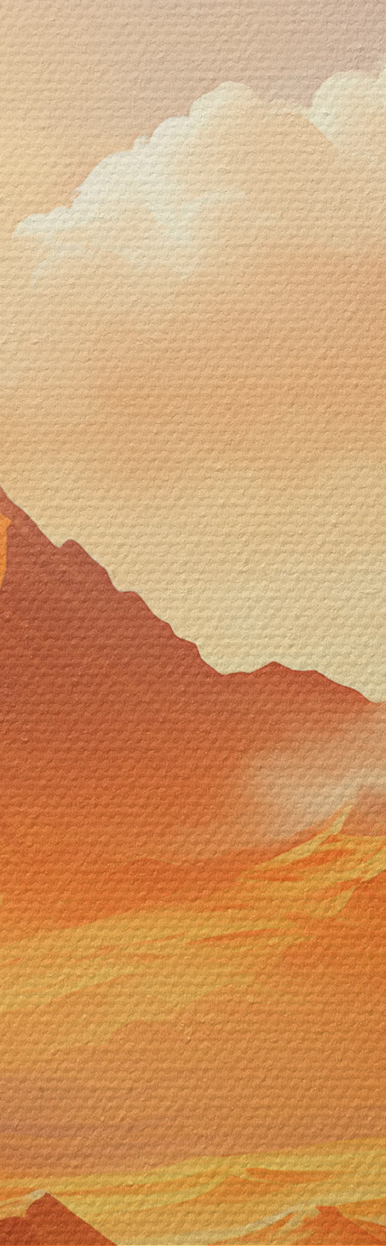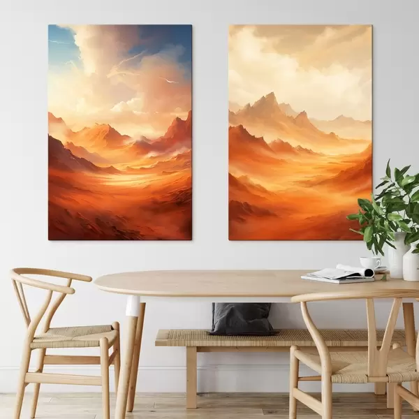 Cuadros Un vasto paisaje desértico de color naranja con imponentes montañas rocosas bajo un cielo brumoso y soleado con nubes tenues. Nr m01122