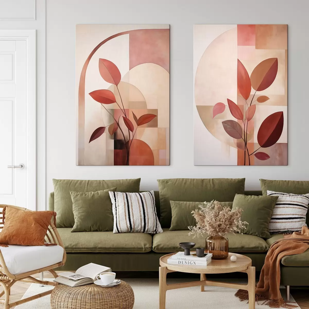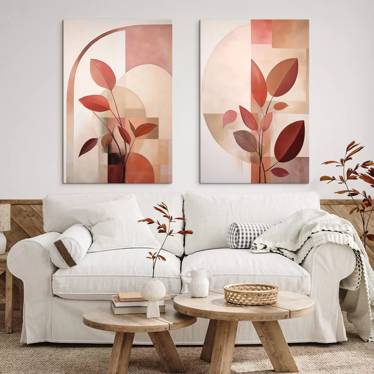 Cuadros Planta abstracta con hojas rojas sobre un fondo de formas geométricas y colores suaves y apagados. Nr m01128
