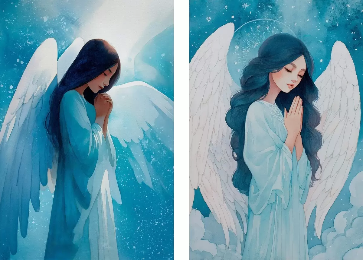 murales de pared Arte sacro moderno en estilo acuarela con la imagen de un ángel guardián con túnicas azules. m01153