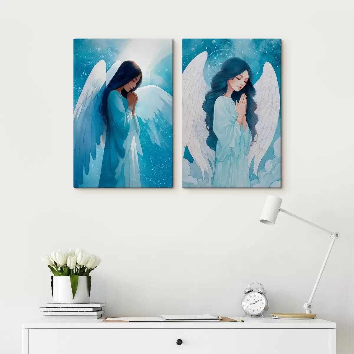 Cuadros Arte sacro moderno en estilo acuarela con la imagen de un ángel guardián con túnicas azules. Nr m01153