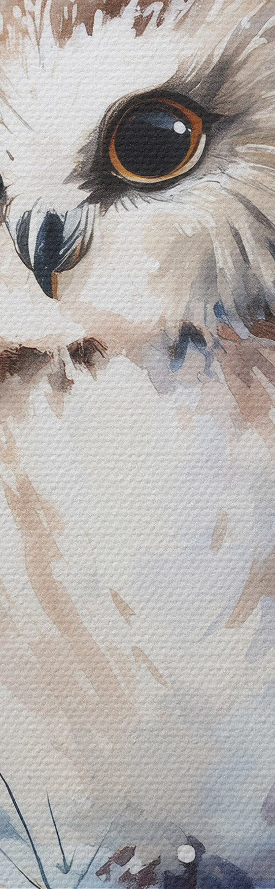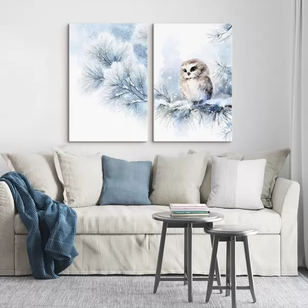 Cuadros Bonito búho sobre una rama de pino cubierta de nieve, pintado al estilo acuarela. Nr m01168