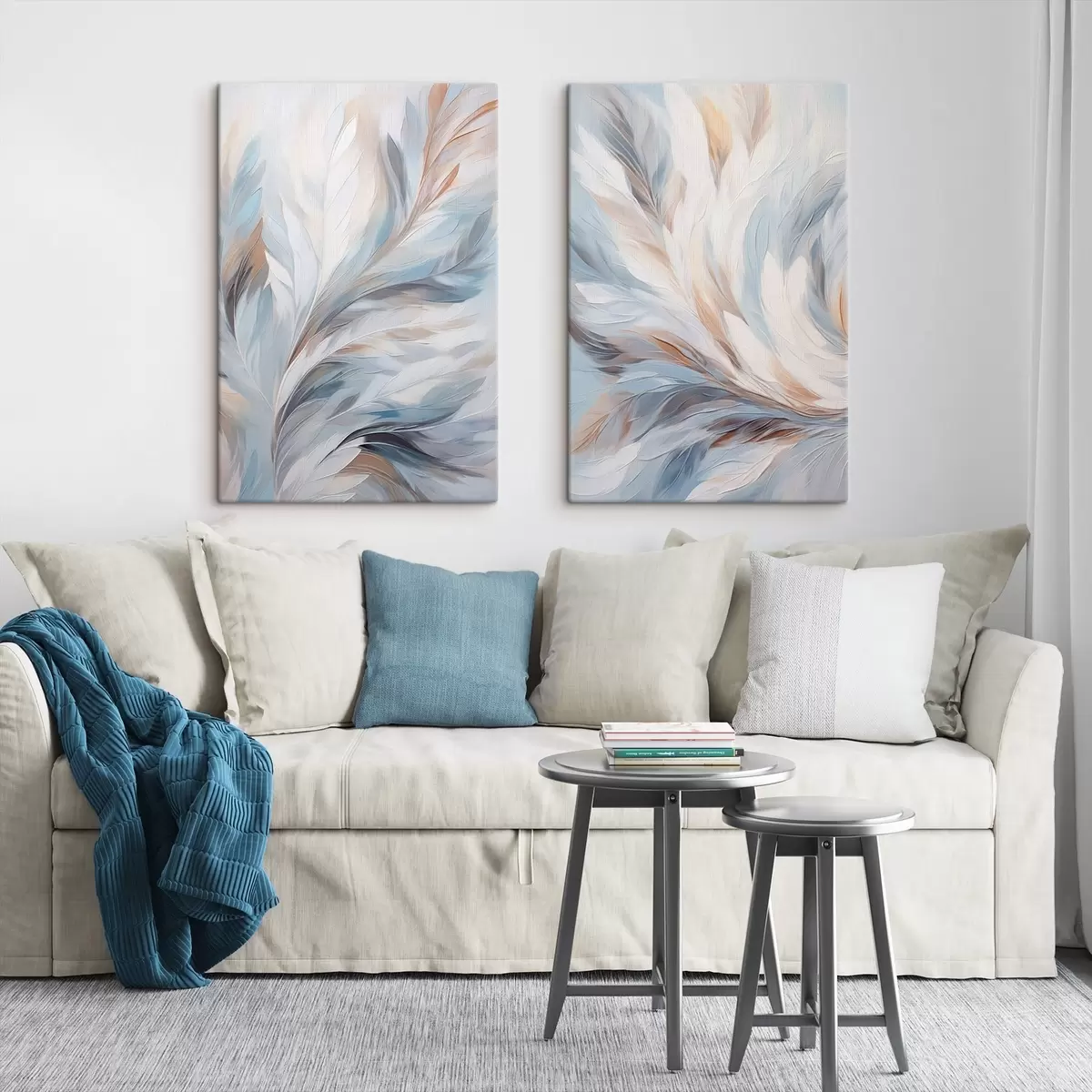 Cuadros Pintura abstracta de plumas en tonos blancos, azules y marrones, con una textura suave y fluida y un fondo claro. Nr m01234