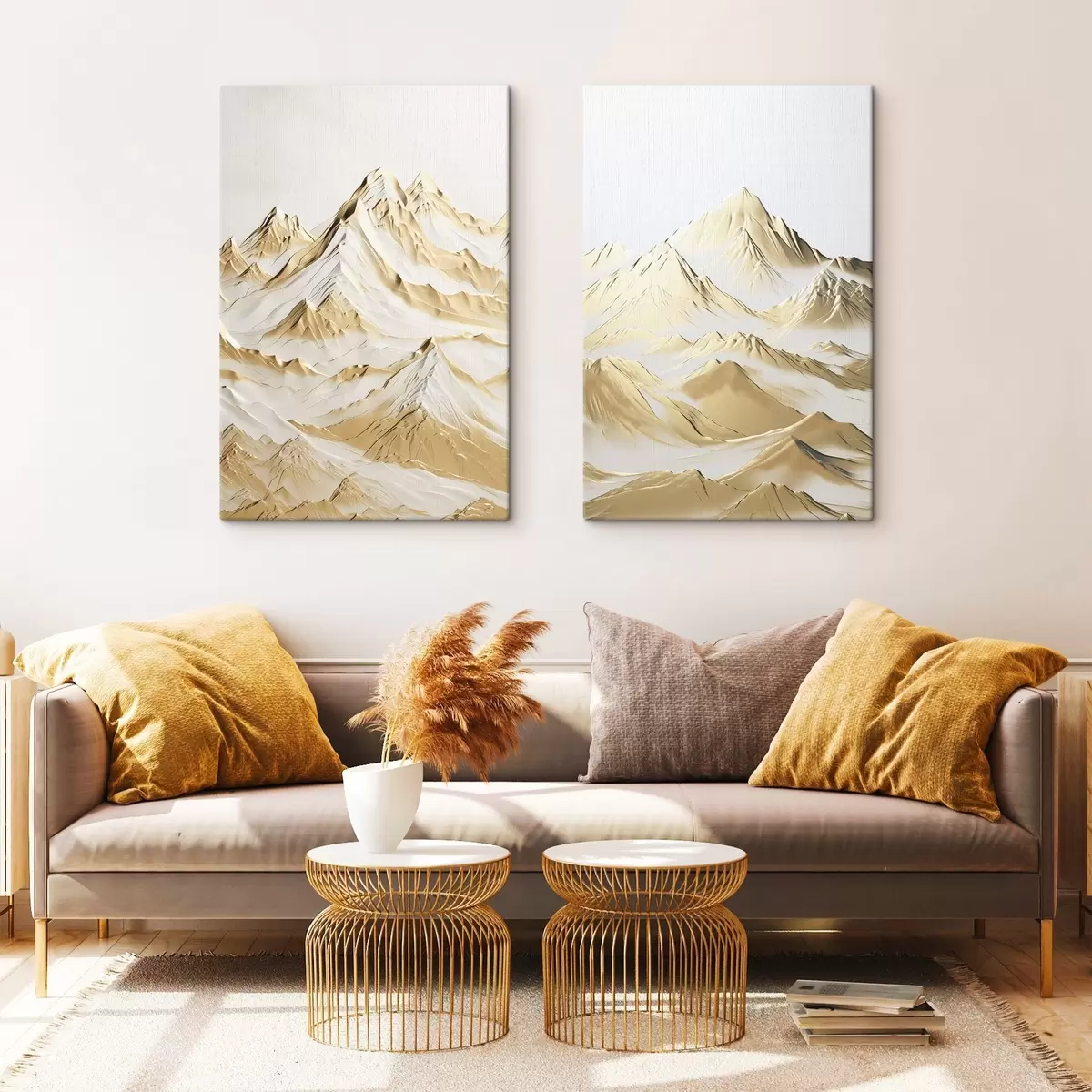 Cuadros Un paisaje de montañas amarillas cubiertas de nieve con picos afilados y valles profundos bajo un cielo claro. Nr m01236