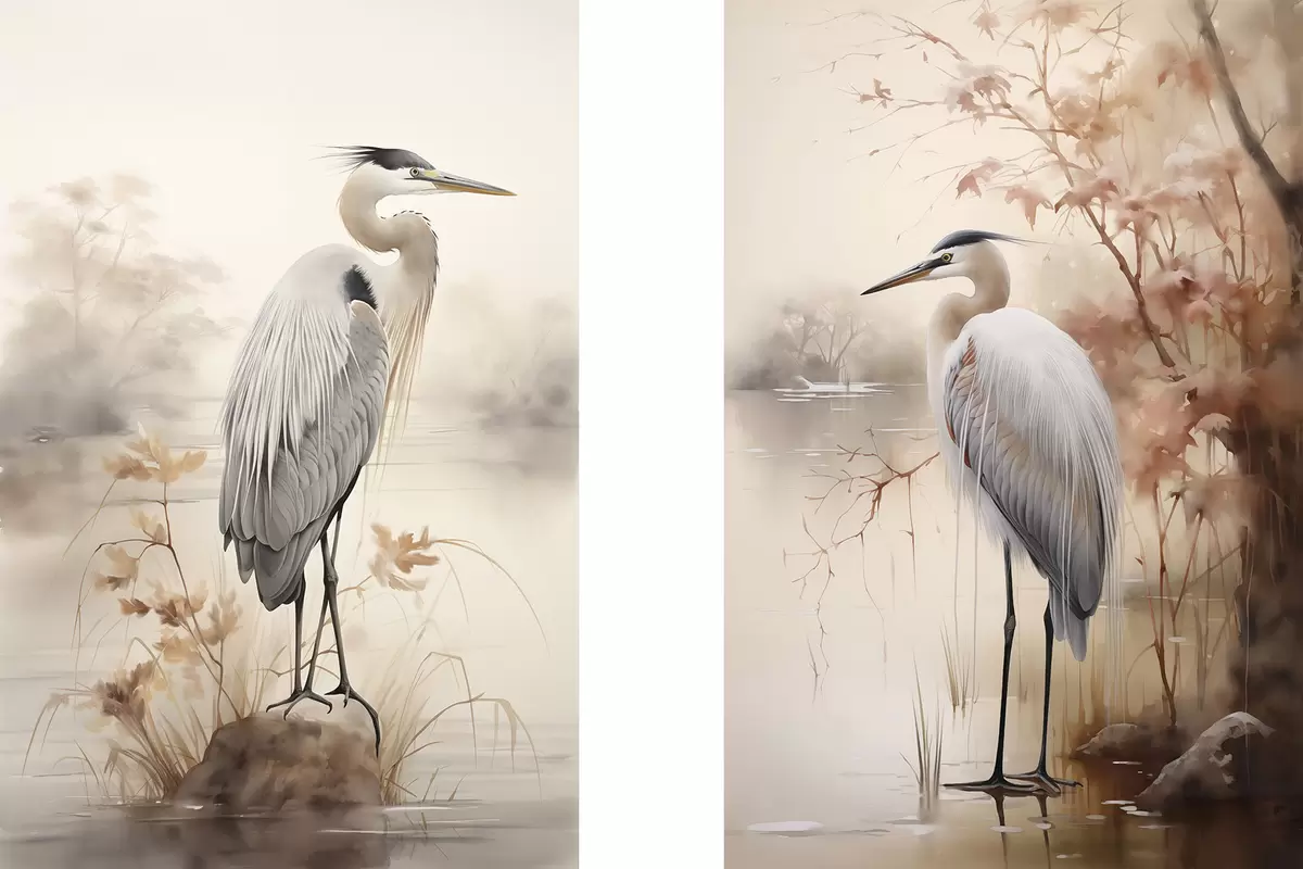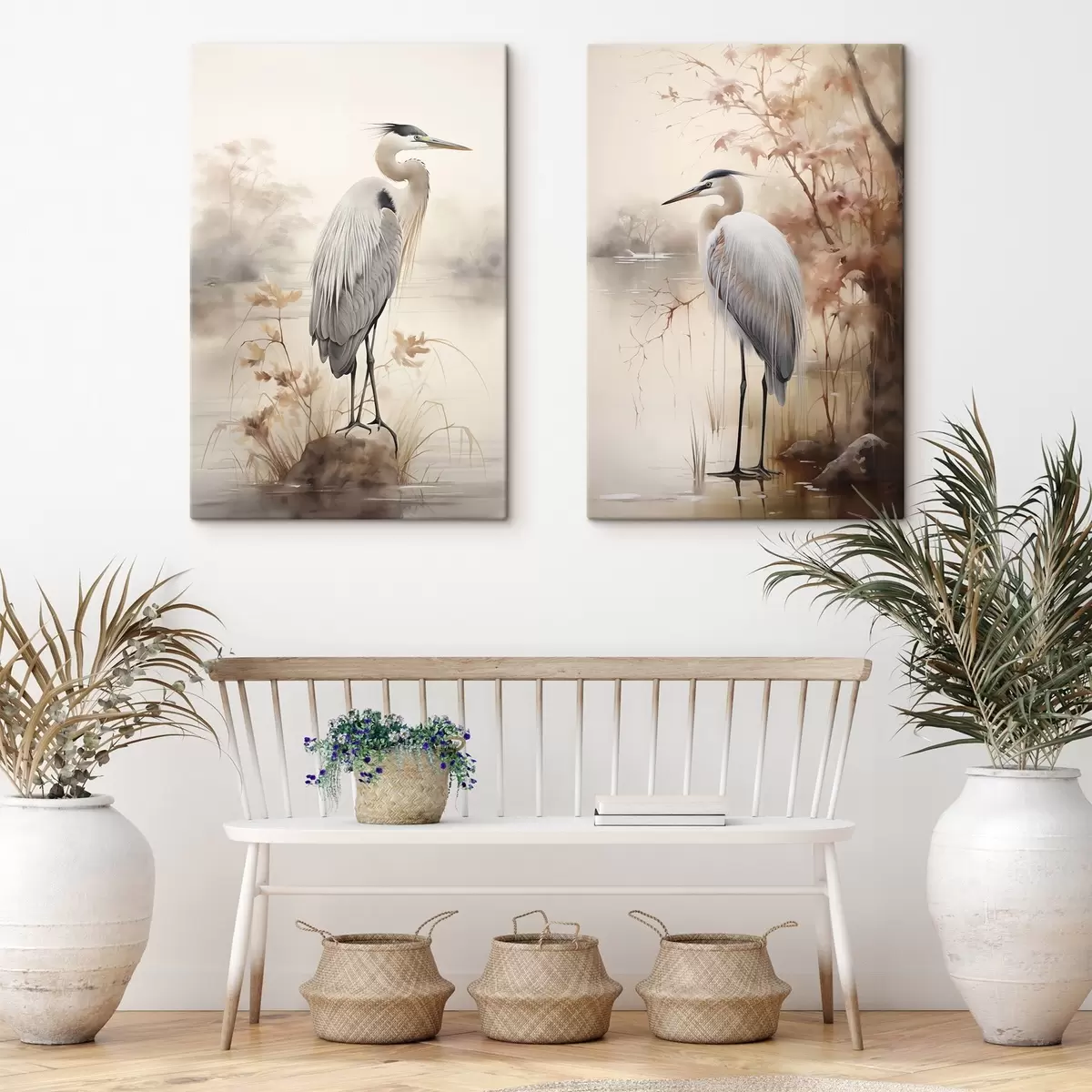 Cuadros Una garza se posa sobre una roca en un lago con altos pastos y árboles al fondo. Nr m01239