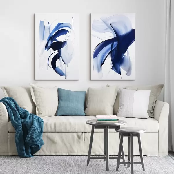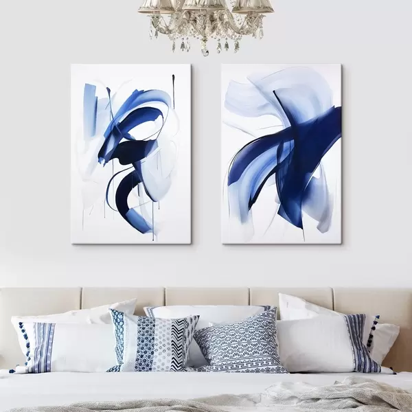 Cuadros Formas abstractas azules similares a pinceladas con líneas y curvas fluidas sobre un fondo blanco, arte moderno. Nr m01240