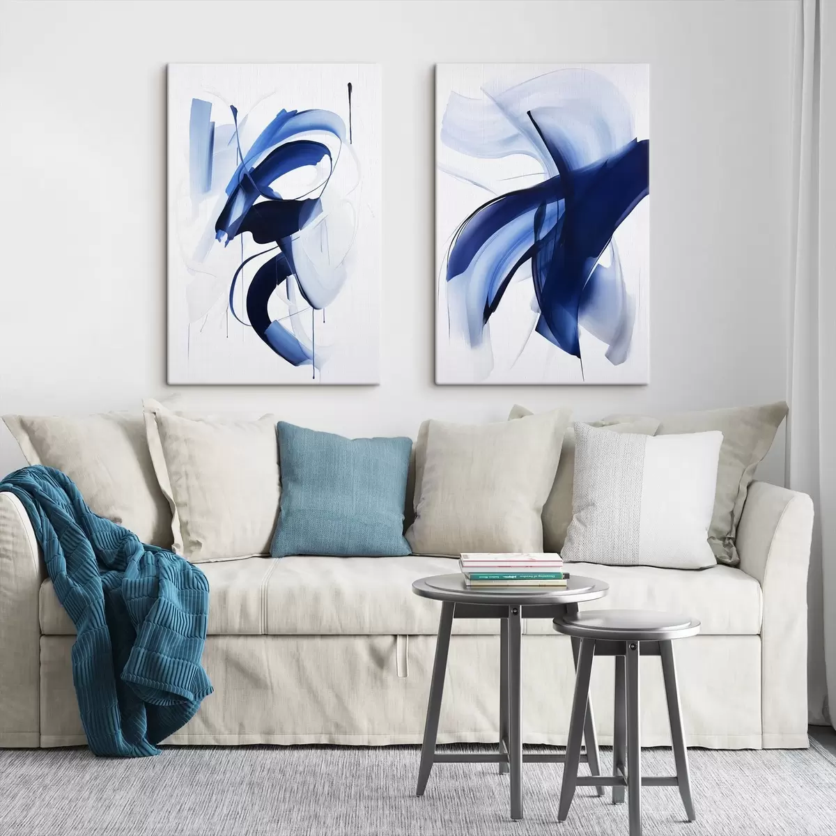murales de pared Formas abstractas azules similares a pinceladas con líneas y curvas fluidas sobre un fondo blanco, arte moderno. m01240