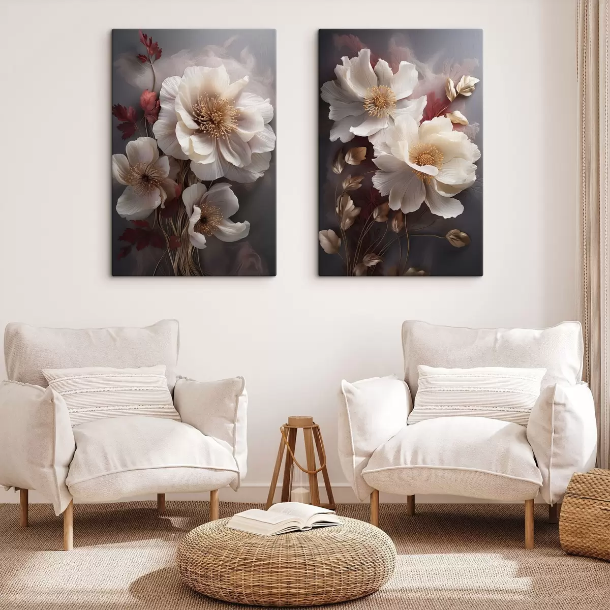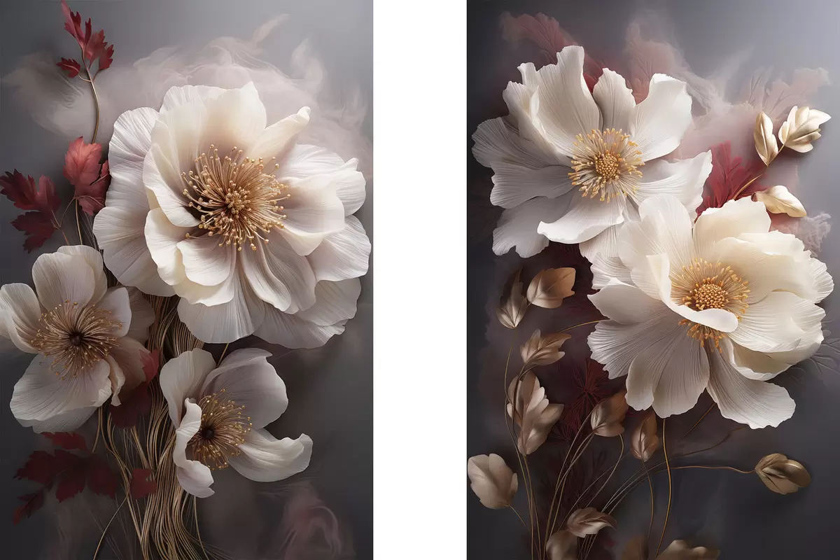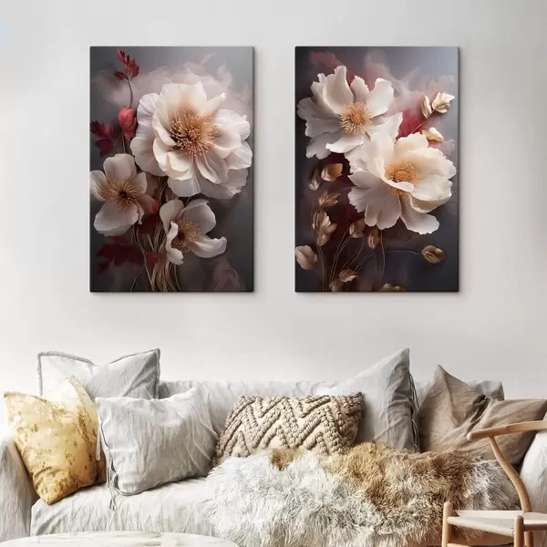 Cuadros Delicadas peonías con pétalos finos y tenues, rodeadas de hojas de color rojo oscuro y amarillo sobre un fondo abstracto. Nr m01243