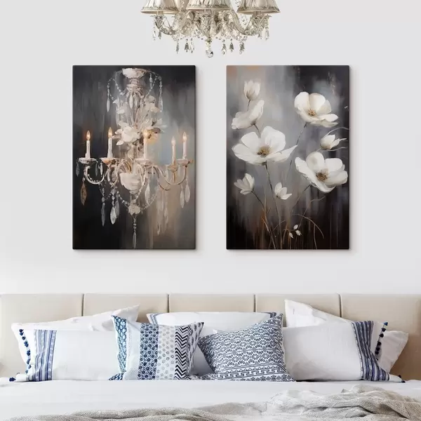 Cuadros Lámpara de araña abstracta y ornamentada con velas encendidas y arte floral, sobre un fondo oscuro y texturizado. Nr m30049