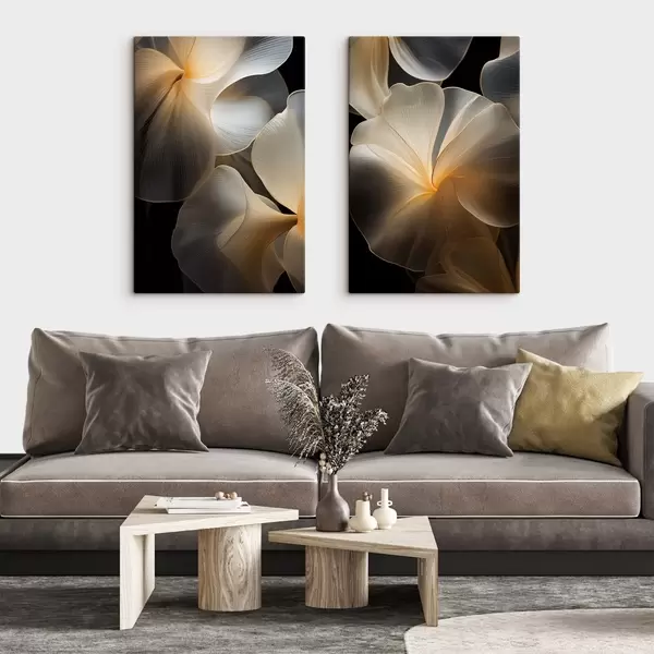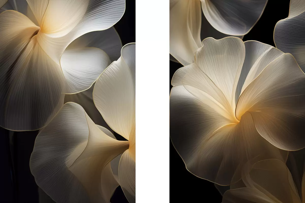 Cuadros Pétalos abstractos fluidos y translúcidos con líneas delicadas, sobre un fondo oscuro. Nr m30050