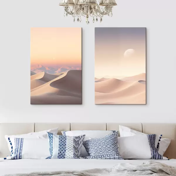 Cuadros Un paisaje desértico con dunas onduladas bajo un cielo de suaves tonos pastel, con montañas lejanas al fondo. Nr m30053