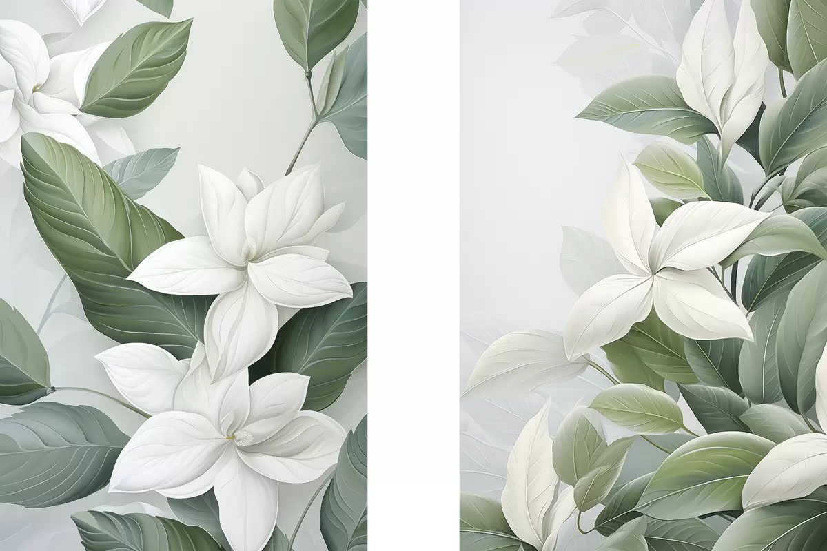 murales de pared Flores blancas con hojas verdes, fondo pastel m30055