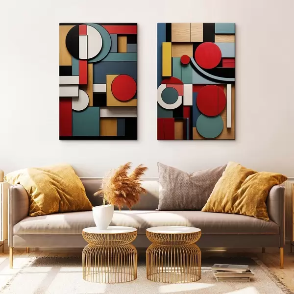 Cuadros Composición geométrica abstracta con imitación de textura de madera, rectángulos y círculos rojos, negros, blancos y verde azulado. Nr m30058