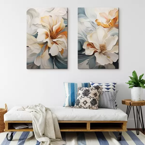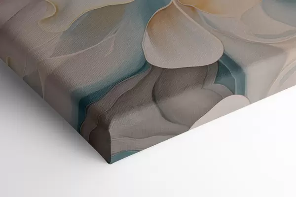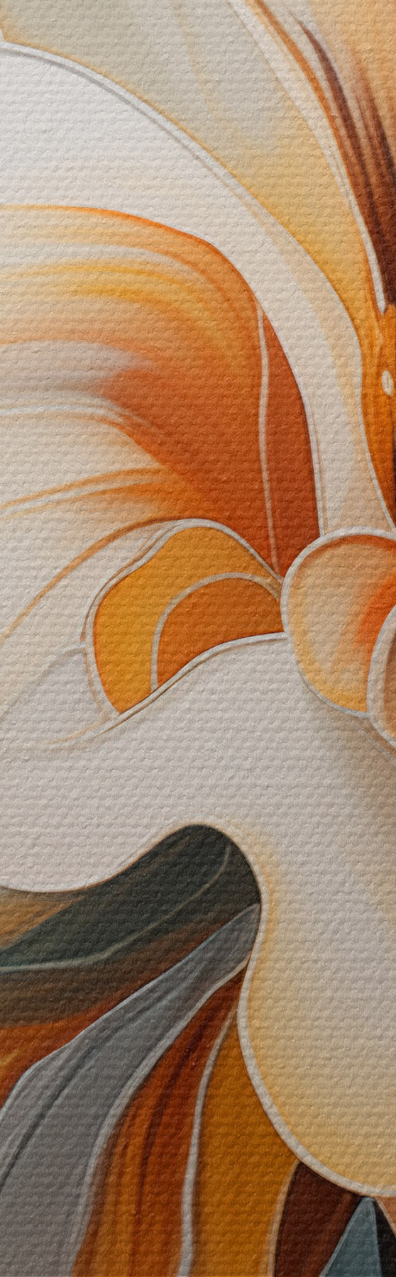 Cuadros Flor abstracta grande con pétalos blancos, naranjas y verde azulado, fondo texturizado. Nr m30059