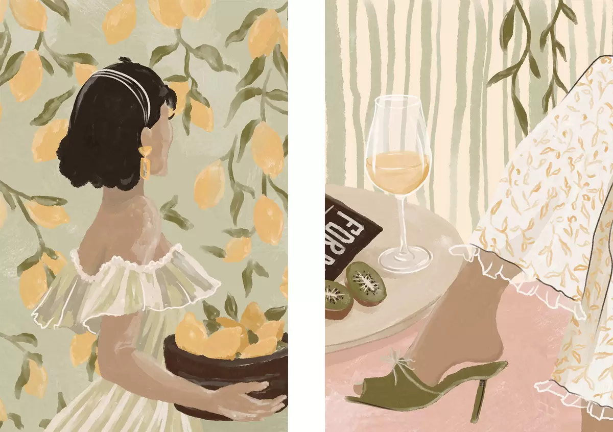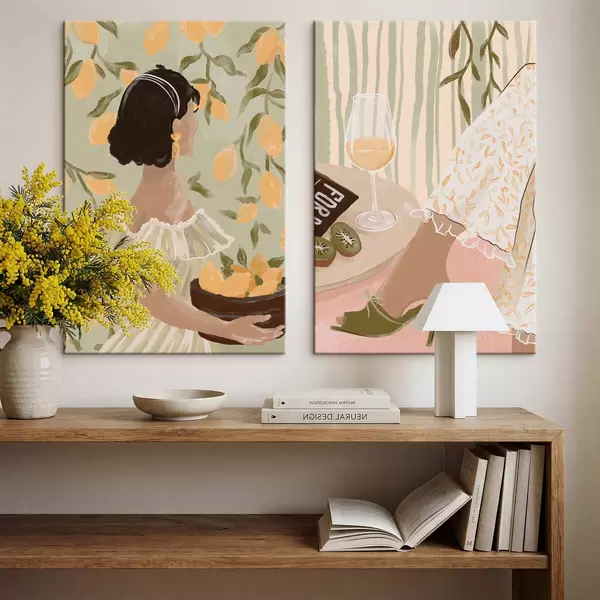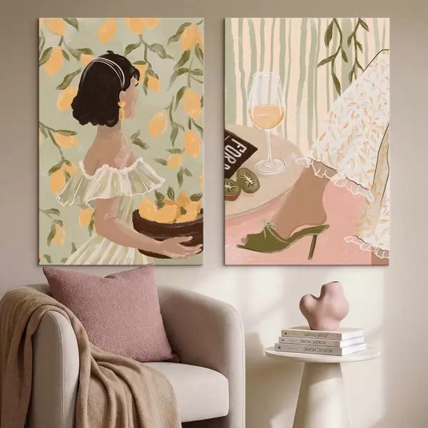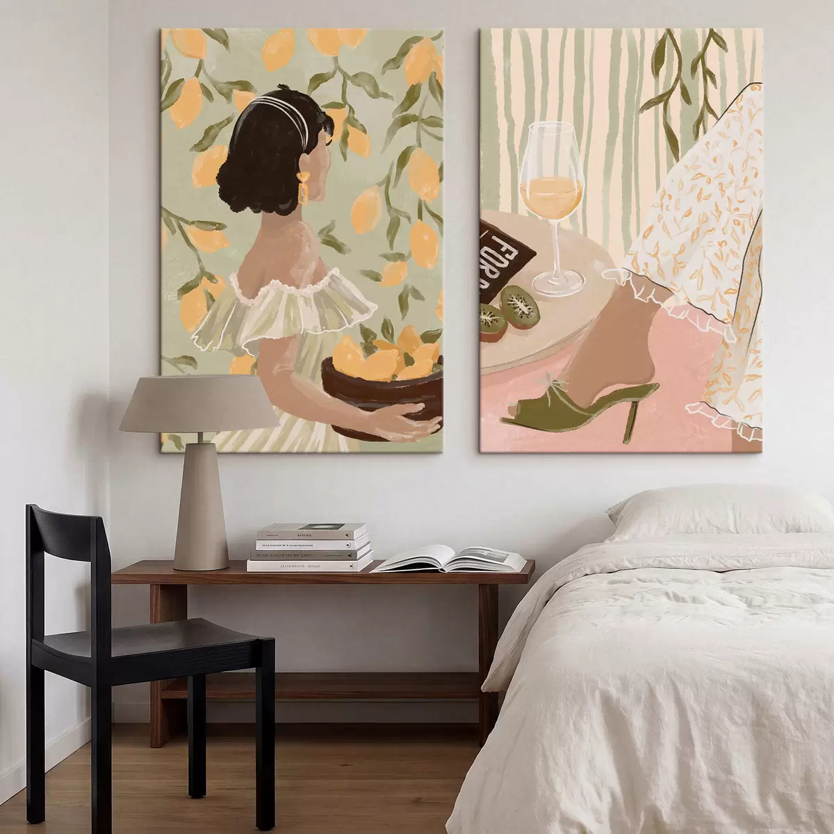 Cuadros Mujer con limones y mesa con vaso Nr m30104