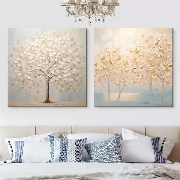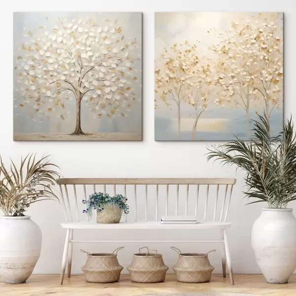 Cuadros Una pintura con textura que representa árboles con hojas blancas y amarillas sobre un fondo azul claro Nr m30200