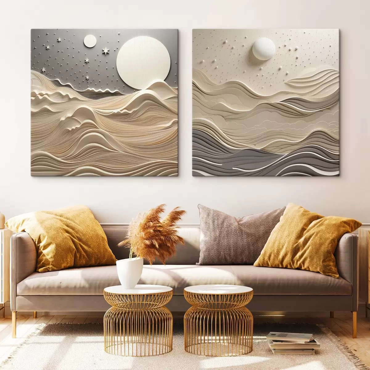 Cuadros Un paisaje minimalista y estilizado con colinas onduladas y una gran luna en un cielo estrellado; arte abstracto Nr m30205