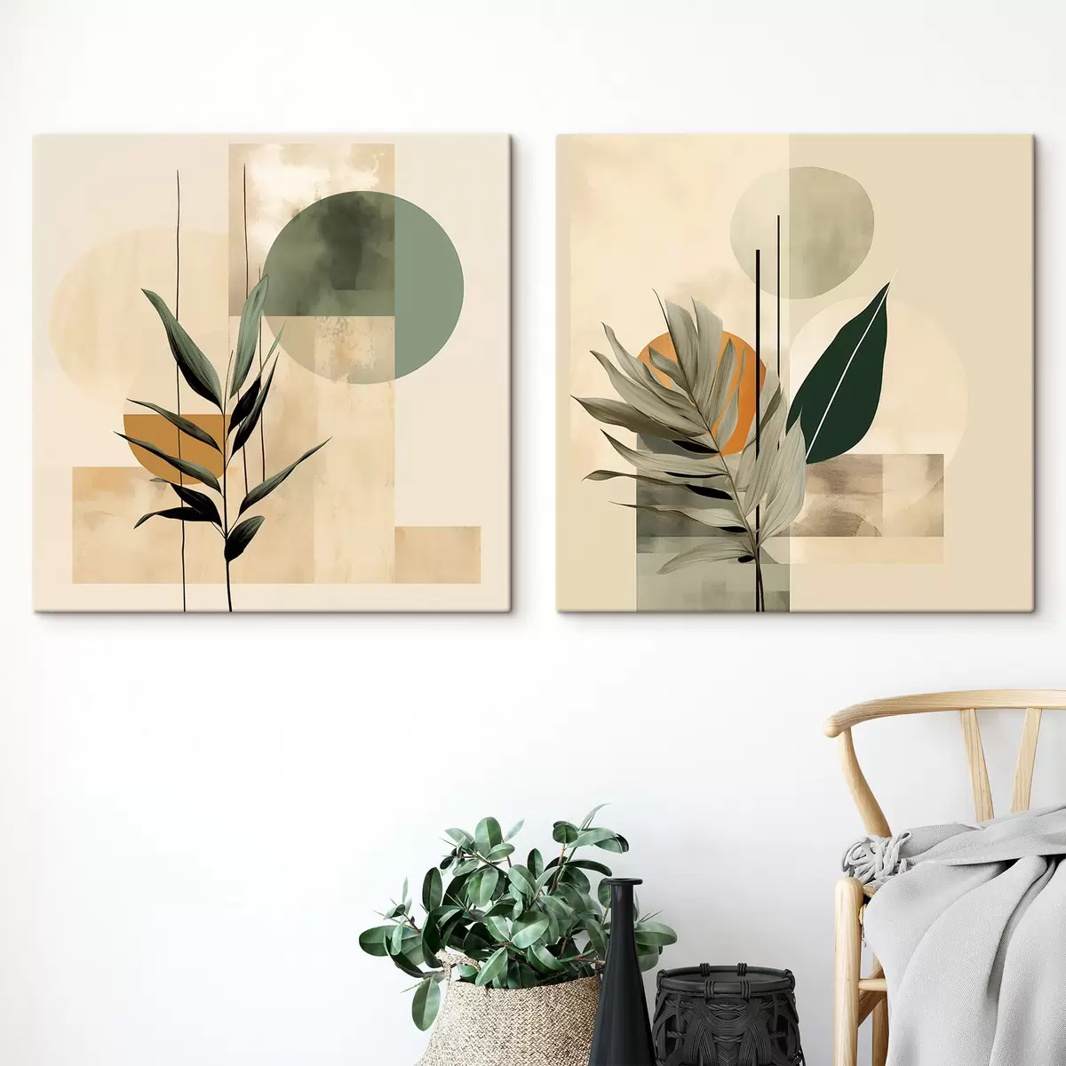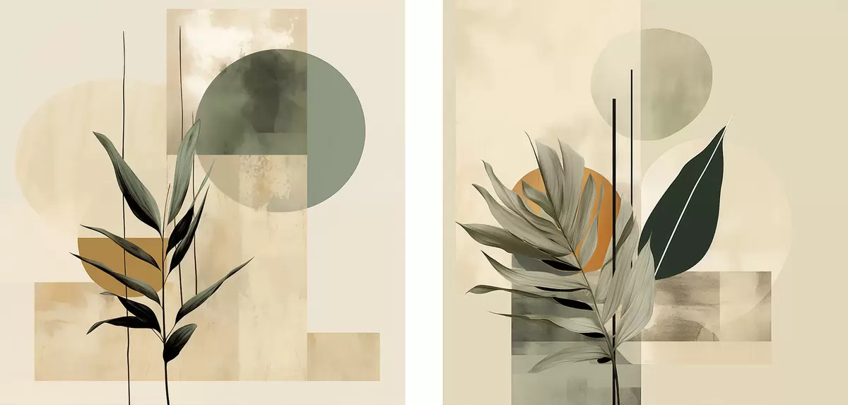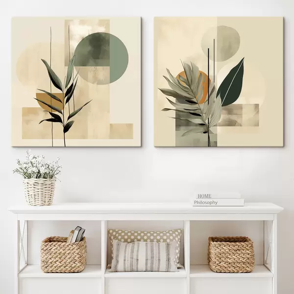 Cuadros Una planta de color verde oscuro con formas geométricas abstractas y texturas de acuarela en tonos beige y verde Nr m30209
