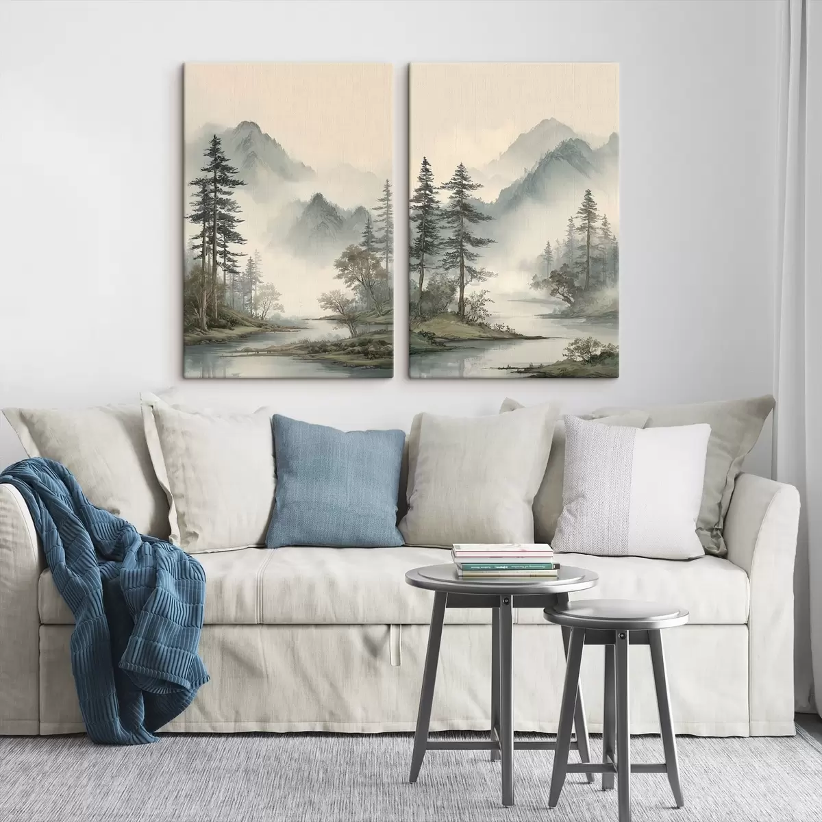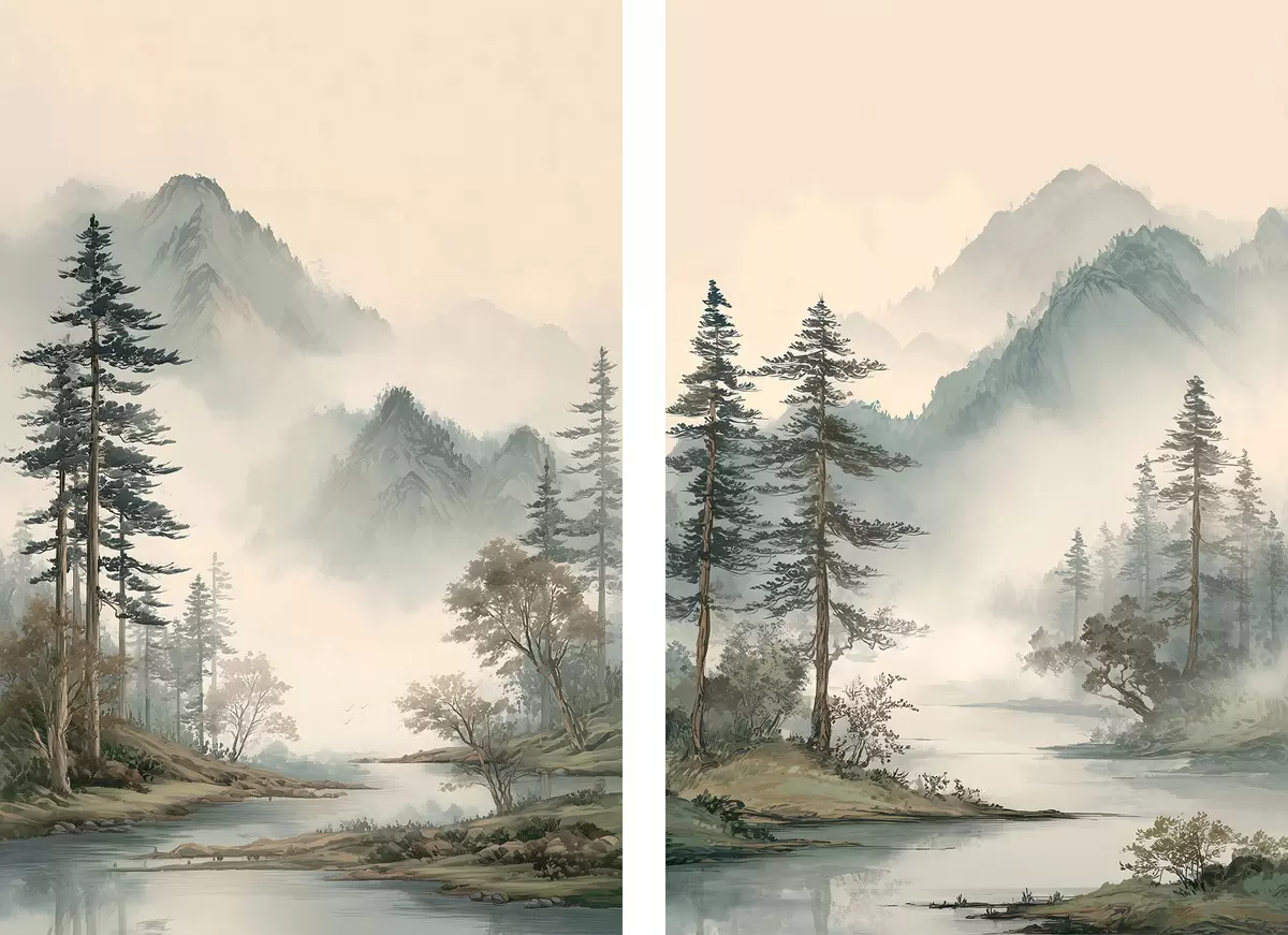murales de pared un paisaje montañoso con pinos y un río m30262