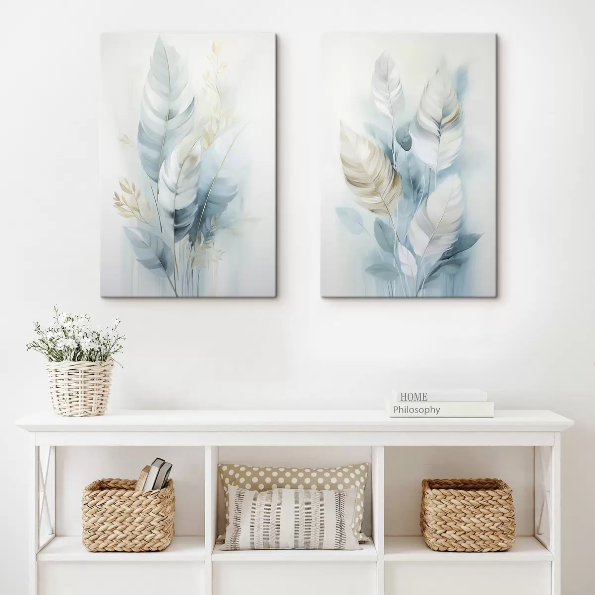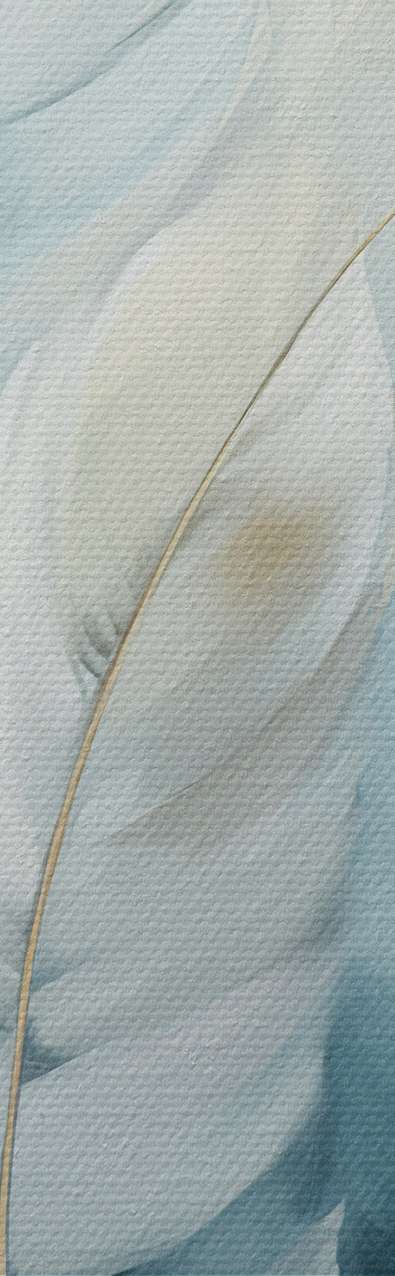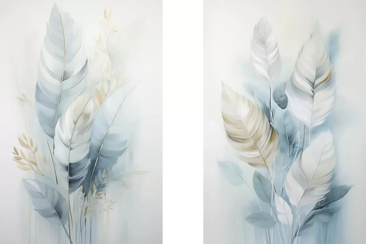 Cuadros Plumas grandes y suaves en tonos azules y blancos con delicadas hojas de color beige Nr m30325