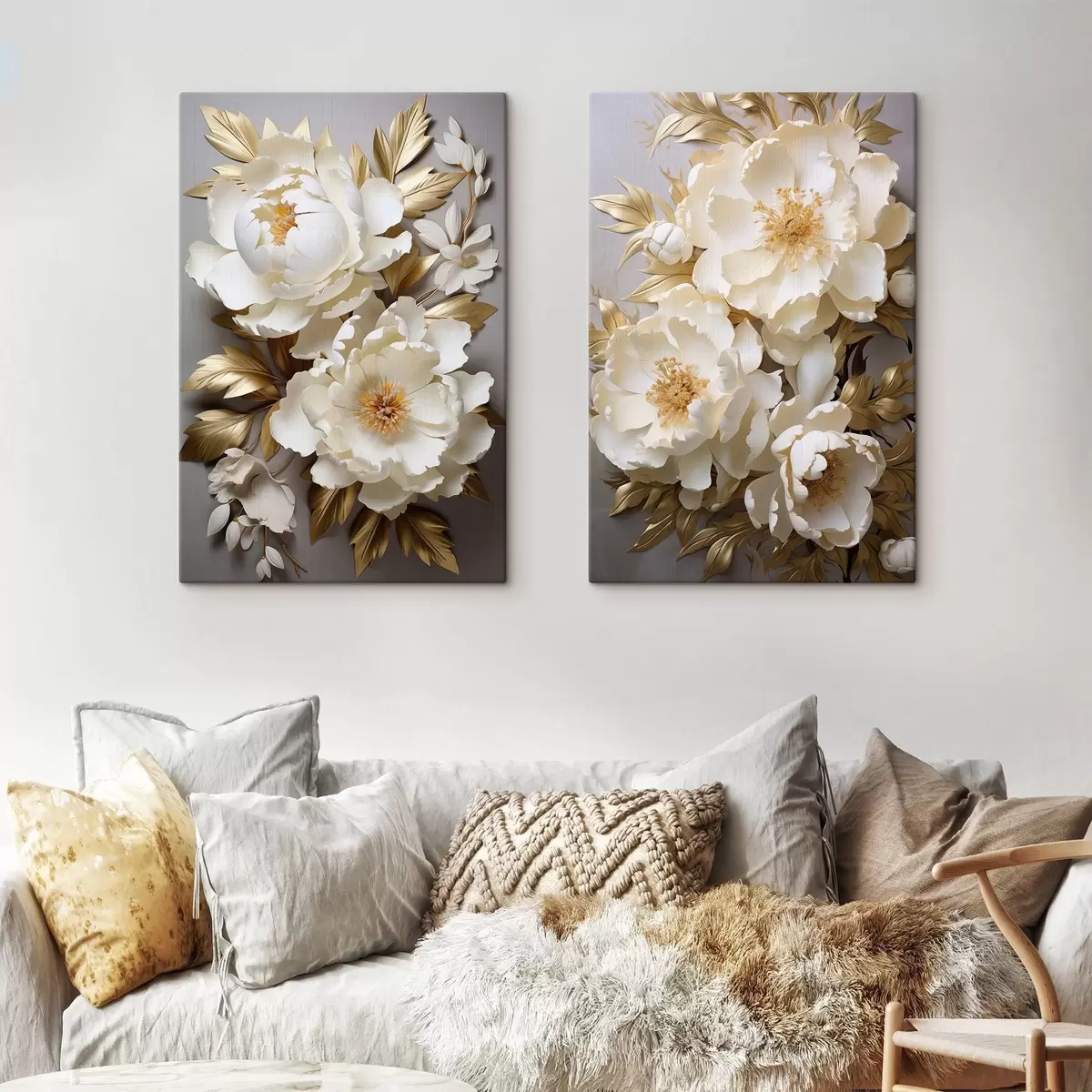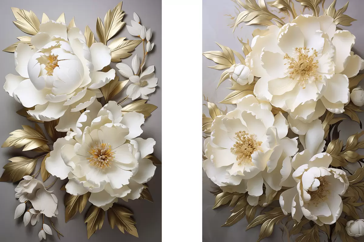 Cuadros Grandes peonías blancas con hojas amarillas sobre un fondo gris Nr m30327