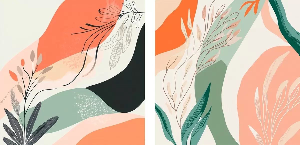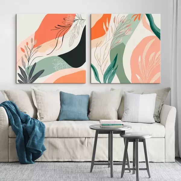 Cuadros Díptico abstracto con motivos vegetales y manchas de color en estilo moderno Nr m30347