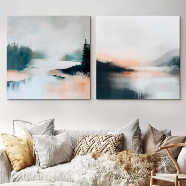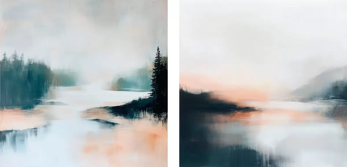Cuadros Paisaje brumoso con coníferas y un lago, pintado en un estilo contemporáneo Nr m30357