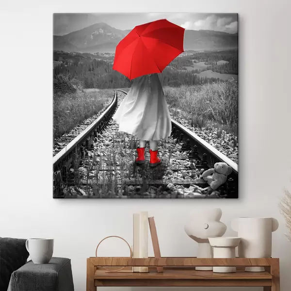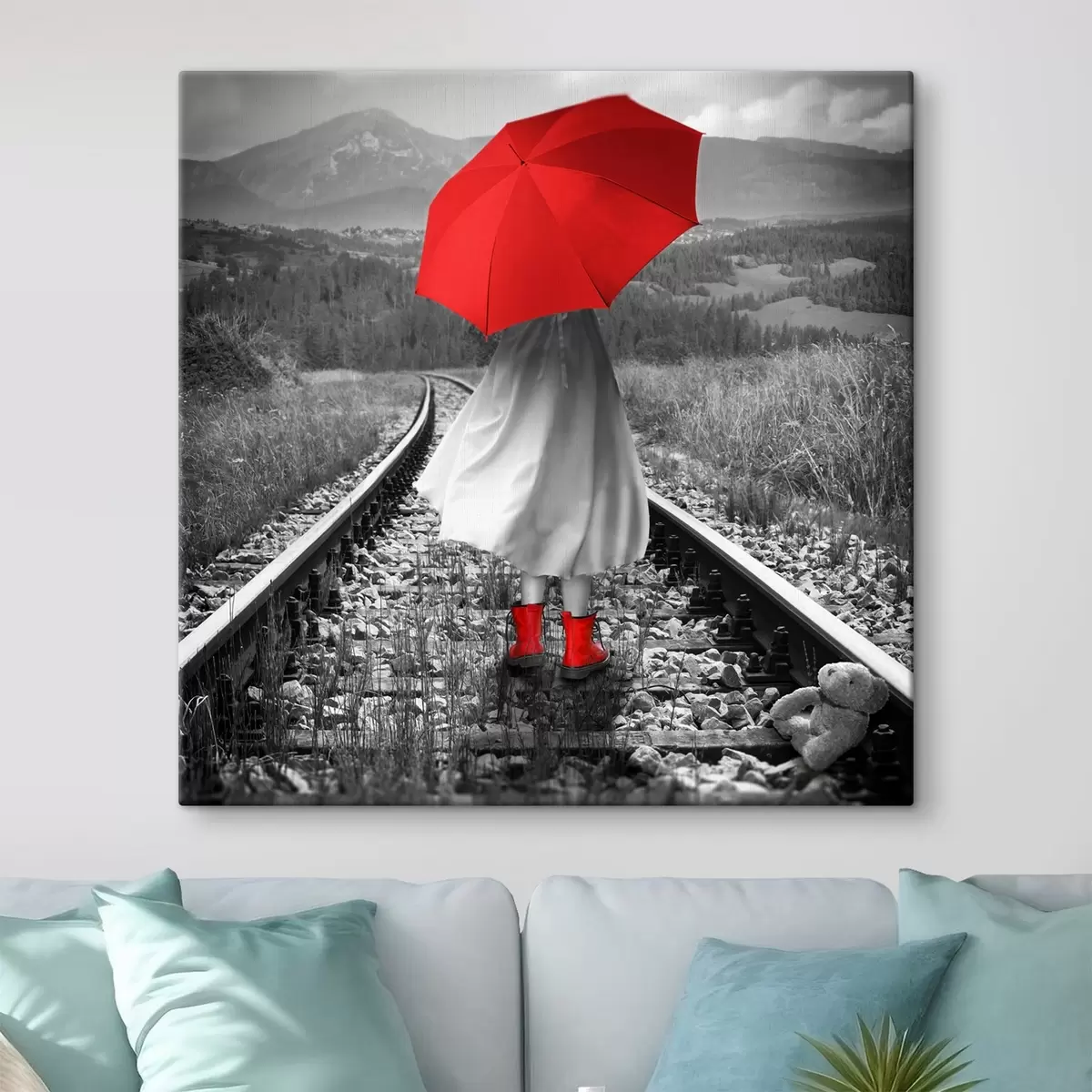 Cuadros Una persona con un paraguas rojo en la vía del tren Nr s37301