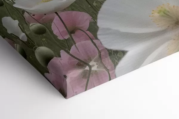 Cuadros Un campo de amapolas rosas y blancas en el paisaje montañoso al fondo Nr s38369