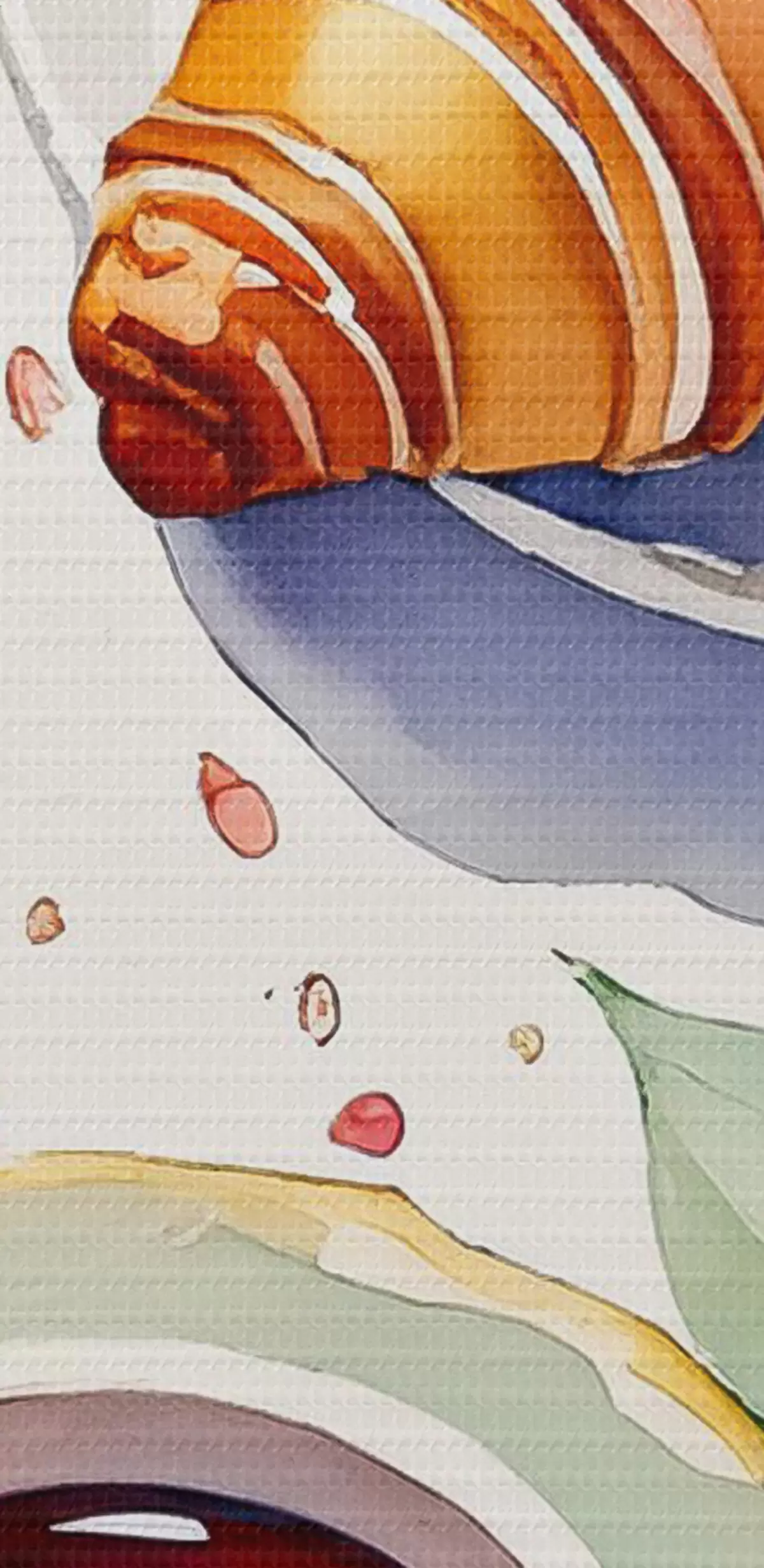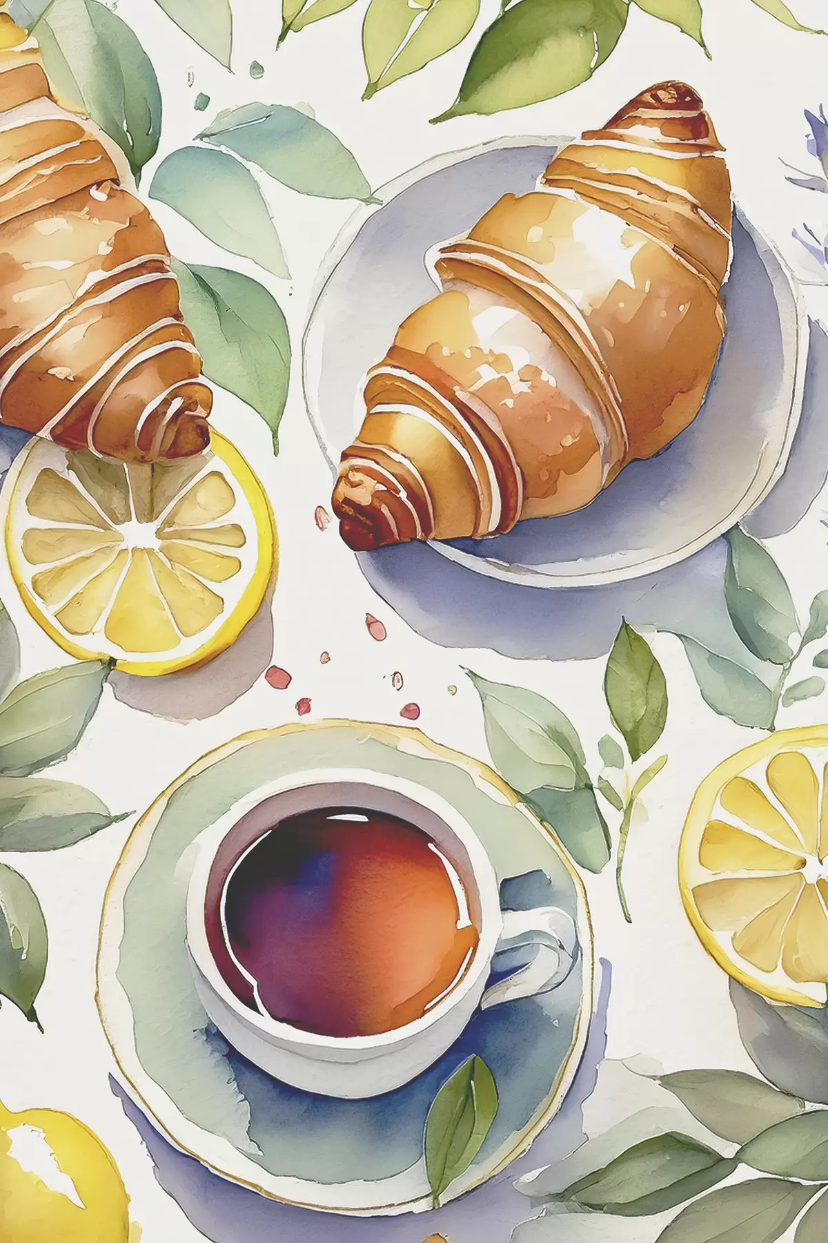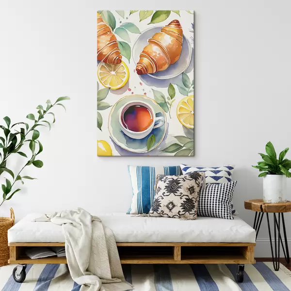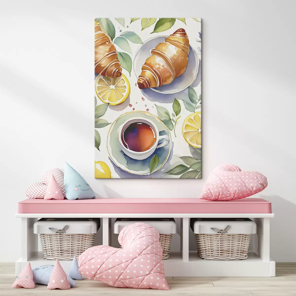 Cuadros Acuarela de croissant, taza de té, desayuno, limones, estilo rústico Nr s38389