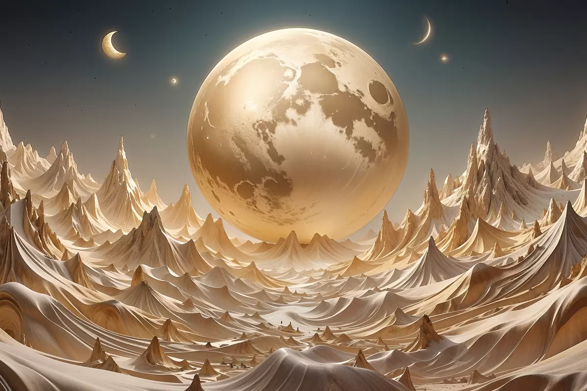Cuadros Luna llena resplandeciente sobre un paisaje montañoso surrealista con picos Nr s38775